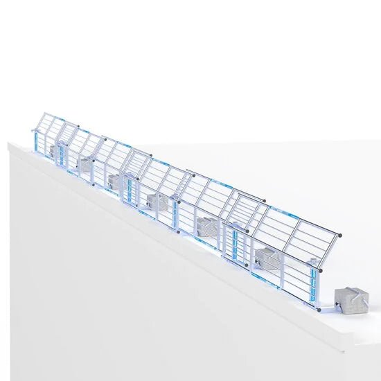 Zertifizierte Absturzsicherung für Flachdächer nach DIN EN 13374, Klasse A. Die kompakte, leichte Konstruktion lässt sich mit wenigen Komponenten schnell und werkzeugfrei montieren – ideal für Photovoltaik-/Solarthermie-Montagen sowie Wartungs- und Installationsarbeiten. Das System erfüllt die Anforderungen der Berufsgenossenschaften.