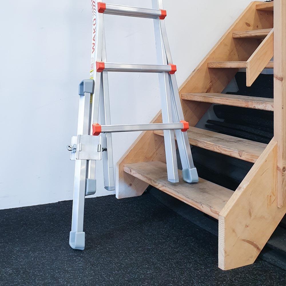 Aus Sicherheitsgründen sollten Leitern immer auf ebenem, rutschfestem Untergrund aufgestellt werden. Wenn sich die Waku-Leiter dennoch auf einer unebenen Fläche befindet (z.B. auf einer Treppe), ist dieses Waku-Verlängerungsbein die Lösung. Dies ist die (sicherste) Möglichkeit, den Höhenunterschied zu beseitigen. In Deutschland hergestellt und aus hochwertigem Aluminium gefertigt.