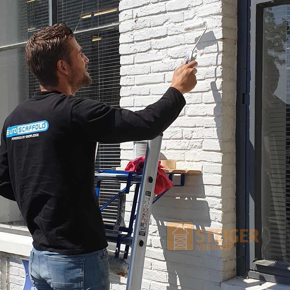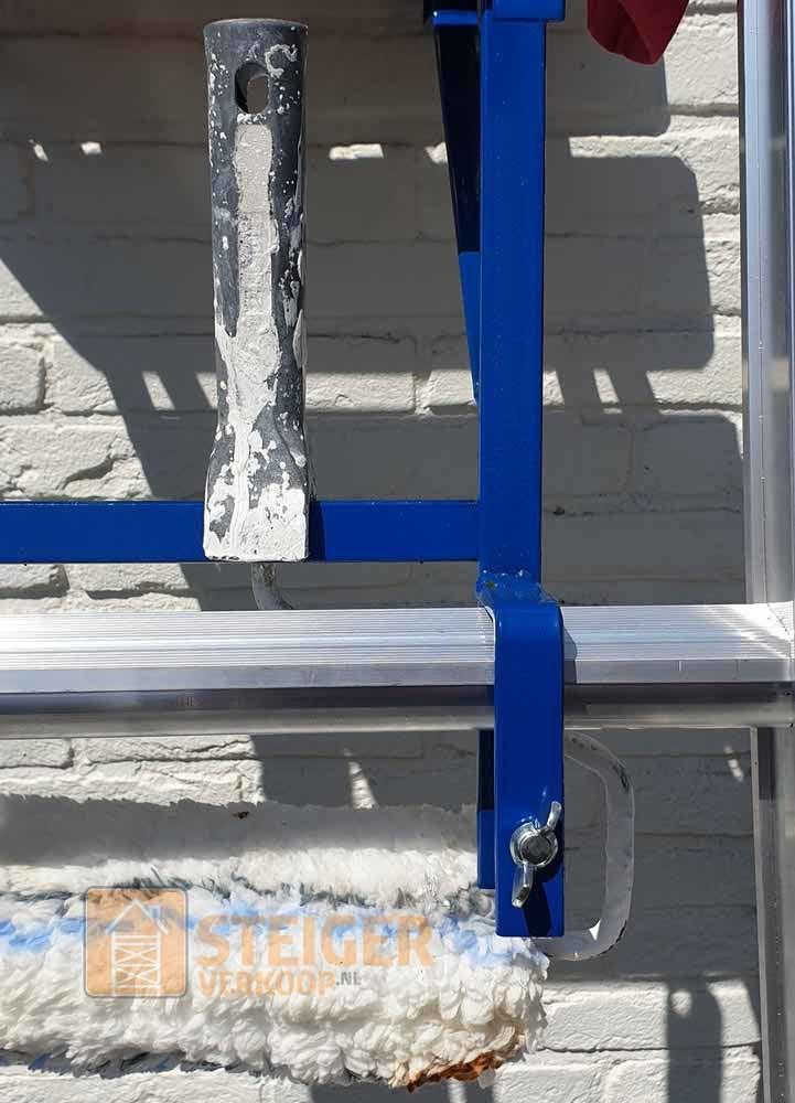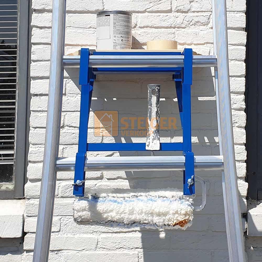 Ein Wand- oder Leiterhalter ist ein professionelles Leiterzubehör, um den Abstand zwischen einer Leiter und einer Wand zu vergrößern. So haben Sie mehr Platz zum Arbeiten und können bequemer arbeiten. Außerdem verhindert ein Leiterhalter, dass z.B. eine Dachrinne beschädigt wird. Der Leiterhalter von Maxall hat eine Holzplattform zum Ablegen von Arbeitsmaterialien und eine praktische Werkzeugablage. Der Wandhalter ist nicht zum Stehen geeignet. Dieser blaue Wandhalter für Leitern ist für Leitern mit 40 mm Sprossen geeignet. Der Abstand zwischen der Wand und der Leiter beträgt ca. 29 cm.