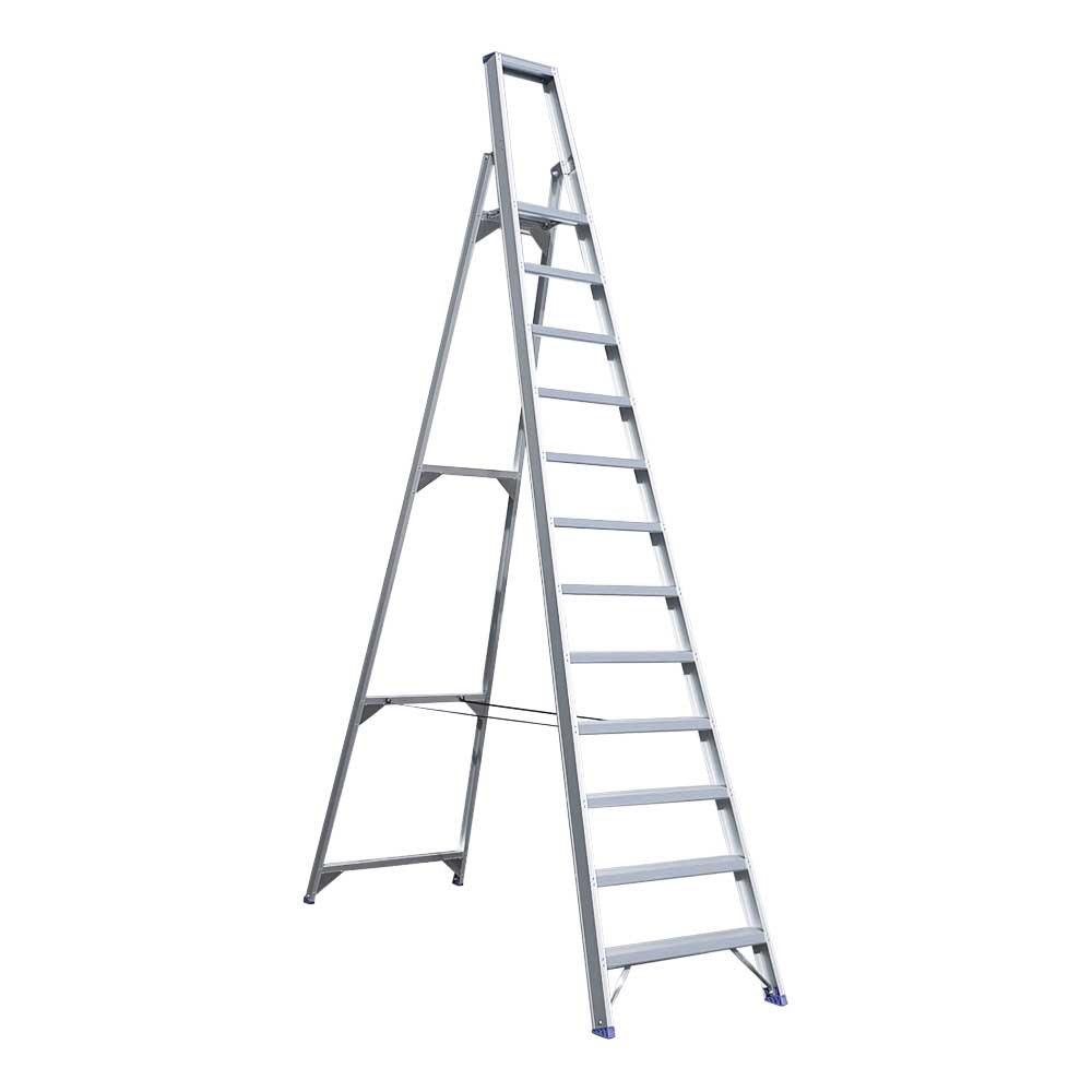 Die robuste Eurostairs-Stehleiter mit zwölf Stufen ist aus hochwertigem Aluminium gefertigt und mit einer schützenden, schmutzabweisenden Beschichtung versehen. Die professionelle Treppe ist genagelt und die Stufen haben ein Antirutschprofil gegen Ausrutschen. Dadurch ist die Treppe sehr stabil und sicher in der Benutzung.