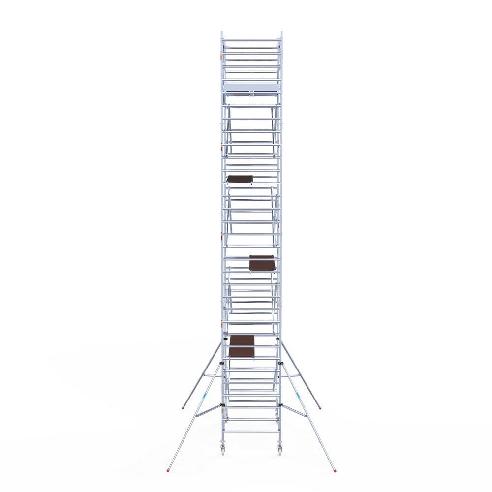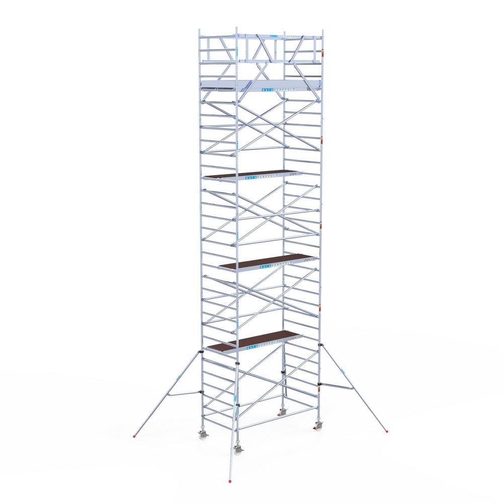 Unsere Rollgerüste sind in verschiedenen Breiten erhältlich, typischerweise 75 cm, 90 cm und 135 cm, abhängig vom jeweiligen Modell und der Produktlinie (semi-professionell oder professionell). Die 75 cm Breite ist ideal für beengte Räume, während 135 cm maximale Arbeitsfläche bietet.