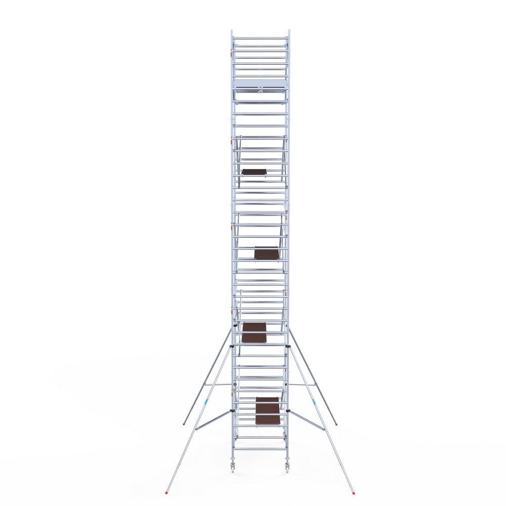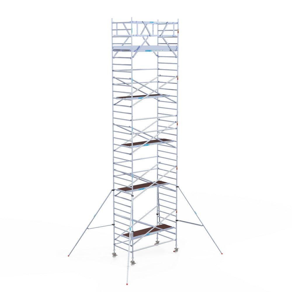 Unsere Rollgerüste sind in verschiedenen Breiten erhältlich, typischerweise 75 cm, 90 cm und 135 cm, abhängig vom jeweiligen Modell und der Produktlinie (semi-professionell oder professionell). Die 75 cm Breite ist ideal für beengte Räume, während 135 cm maximale Arbeitsfläche bietet.