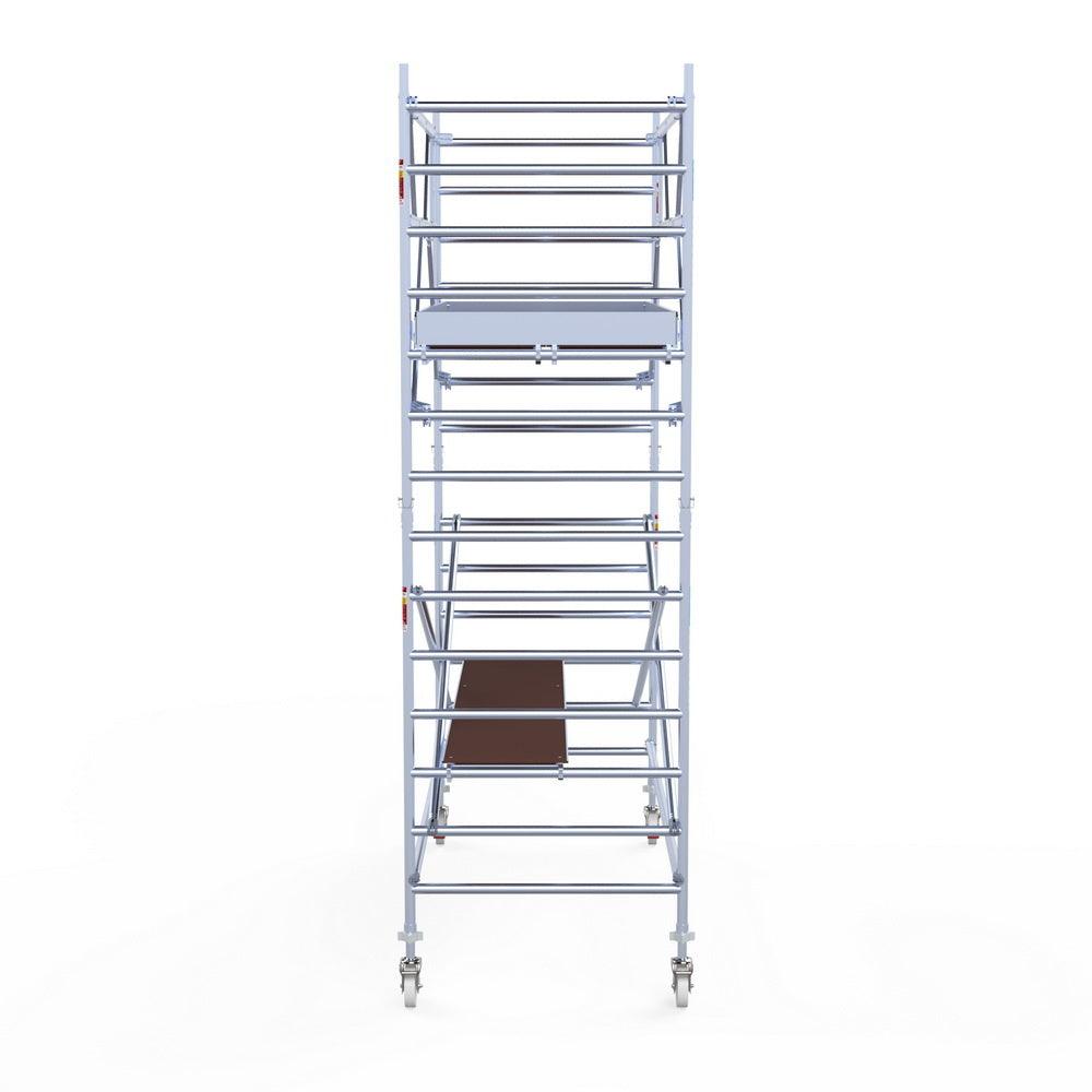 Unsere Rollgerüste sind in verschiedenen Breiten erhältlich, typischerweise 75 cm, 90 cm und 135 cm, abhängig vom jeweiligen Modell und der Produktlinie (semi-professionell oder professionell). Die 75 cm Breite ist ideal für beengte Räume, während 135 cm maximale Arbeitsfläche bietet.