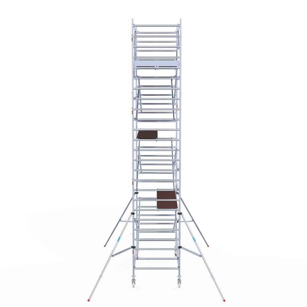 Unsere Rollgerüste sind in verschiedenen Breiten erhältlich, typischerweise 75 cm, 90 cm und 135 cm, abhängig vom jeweiligen Modell und der Produktlinie (semi-professionell oder professionell). Die 75 cm Breite ist ideal für beengte Räume, während 135 cm maximale Arbeitsfläche bietet.