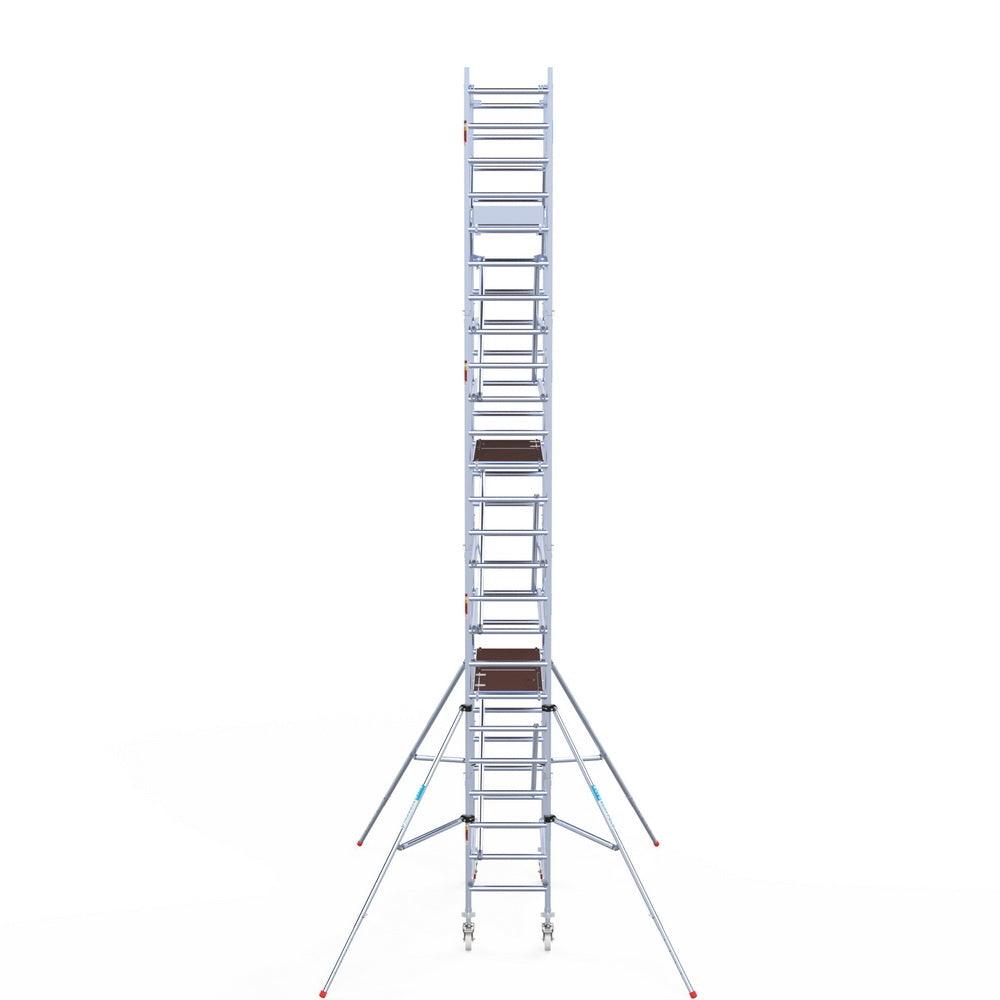 Unsere Rollgerüste sind in verschiedenen Breiten erhältlich, typischerweise 75 cm, 90 cm und 135 cm, abhängig vom jeweiligen Modell und der Produktlinie (semi-professionell oder professionell). Die 75 cm Breite ist ideal für beengte Räume, während 135 cm maximale Arbeitsfläche bietet.
