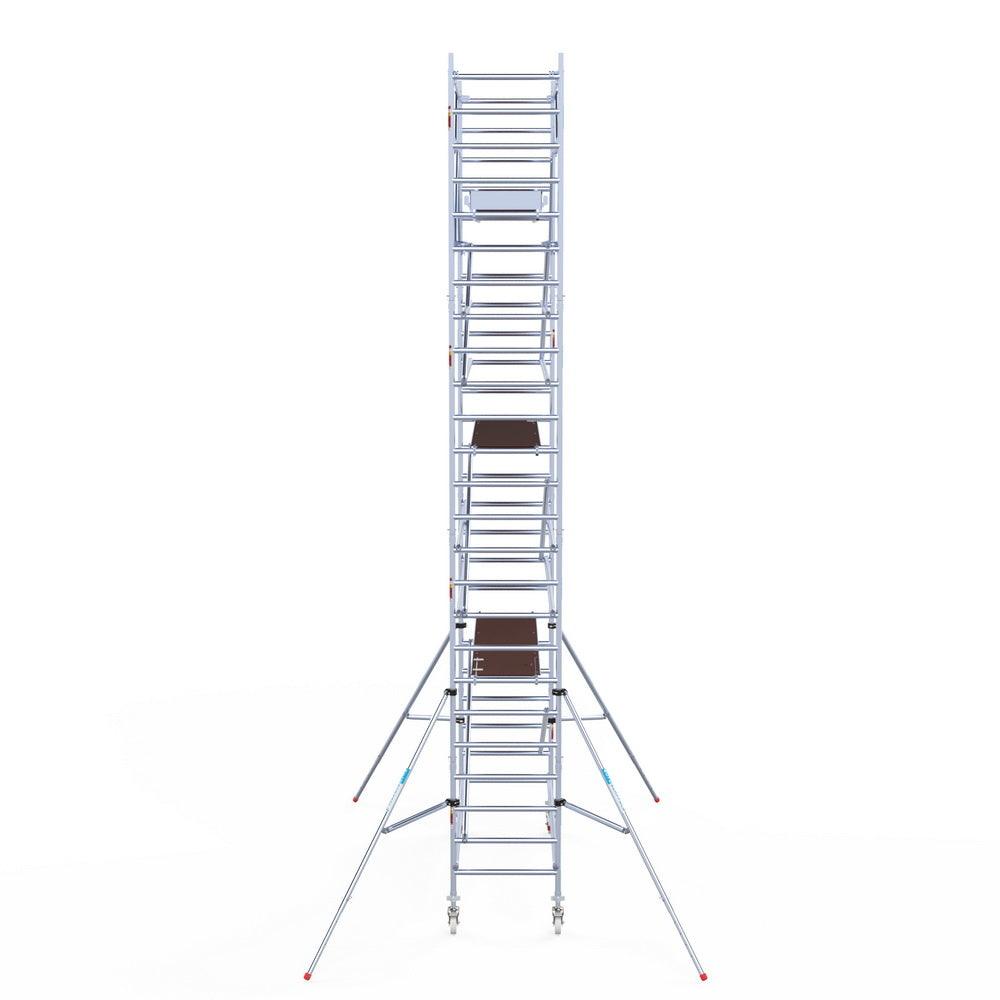 Unsere Rollgerüste sind in verschiedenen Breiten erhältlich, typischerweise 75 cm, 90 cm und 135 cm, abhängig vom jeweiligen Modell und der Produktlinie (semi-professionell oder professionell). Die 75 cm Breite ist ideal für beengte Räume, während 135 cm maximale Arbeitsfläche bietet.