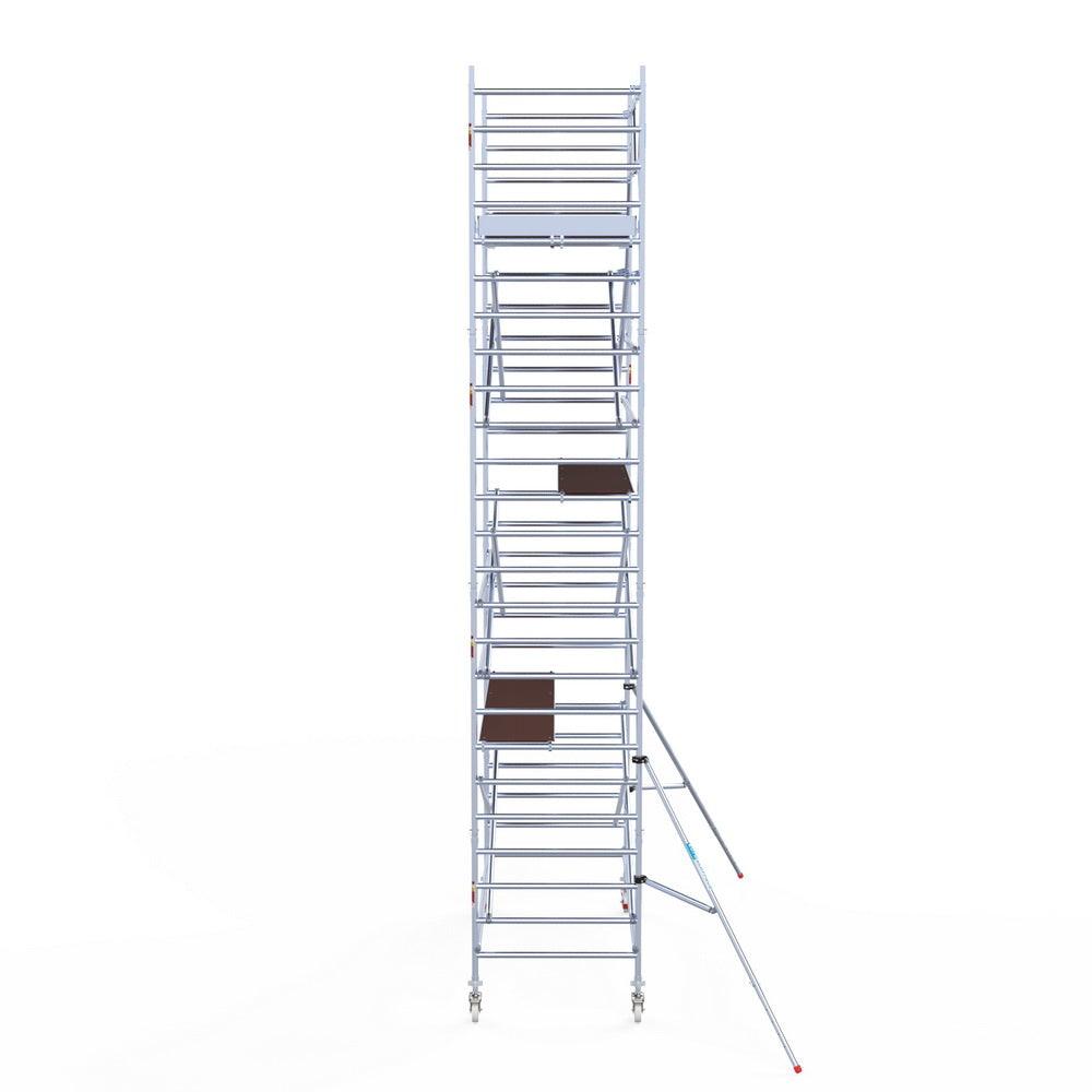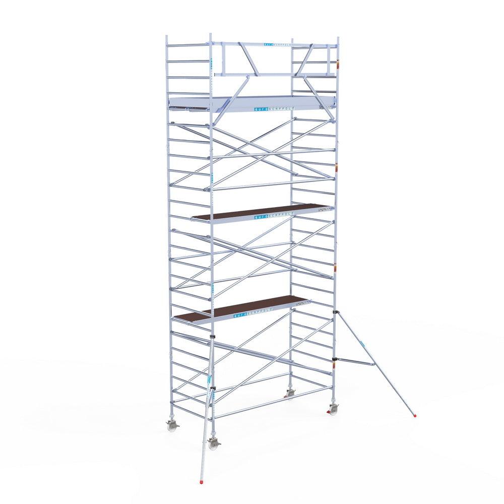 Unsere Rollgerüste sind in verschiedenen Breiten erhältlich, typischerweise 75 cm, 90 cm und 135 cm, abhängig vom jeweiligen Modell und der Produktlinie (semi-professionell oder professionell). Die 75 cm Breite ist ideal für beengte Räume, während 135 cm maximale Arbeitsfläche bietet.