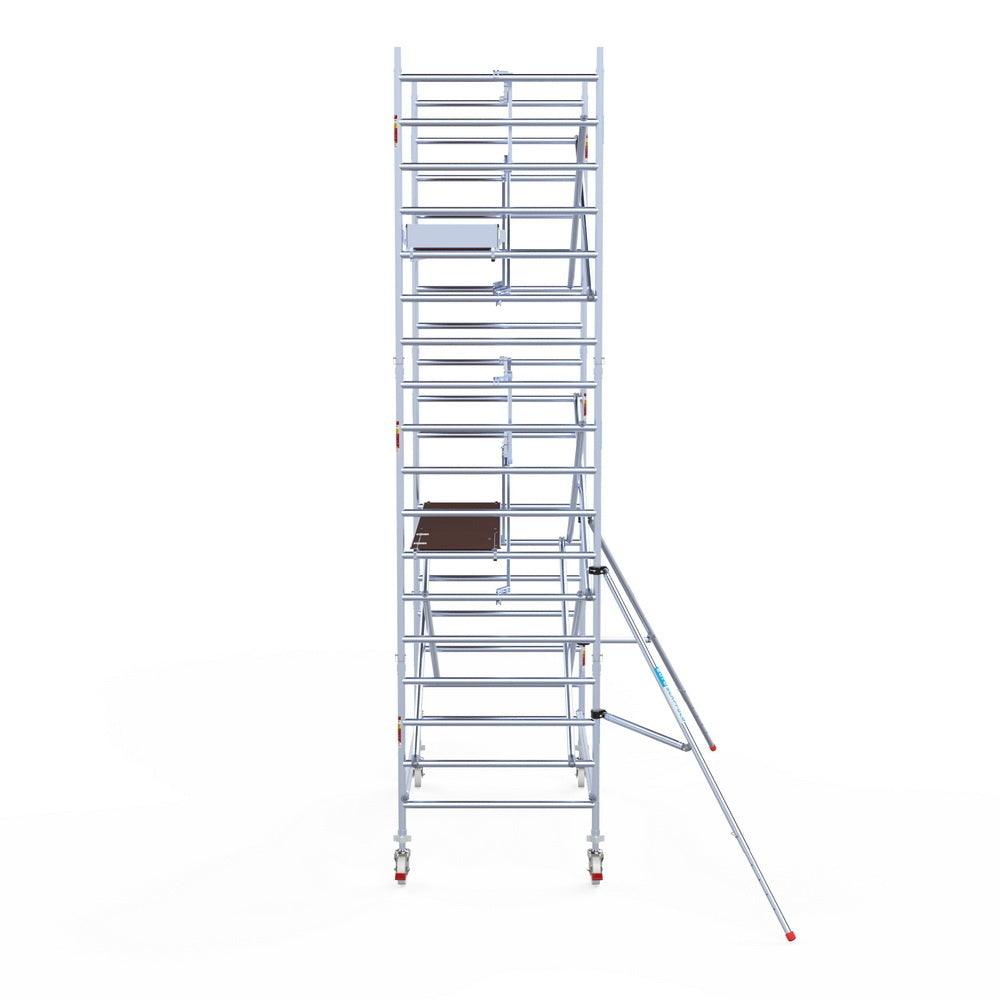 Unsere Rollgerüste sind in verschiedenen Breiten erhältlich, typischerweise 75 cm, 90 cm und 135 cm, abhängig vom jeweiligen Modell und der Produktlinie (semi-professionell oder professionell). Die 75 cm Breite ist ideal für beengte Räume, während 135 cm maximale Arbeitsfläche bietet.