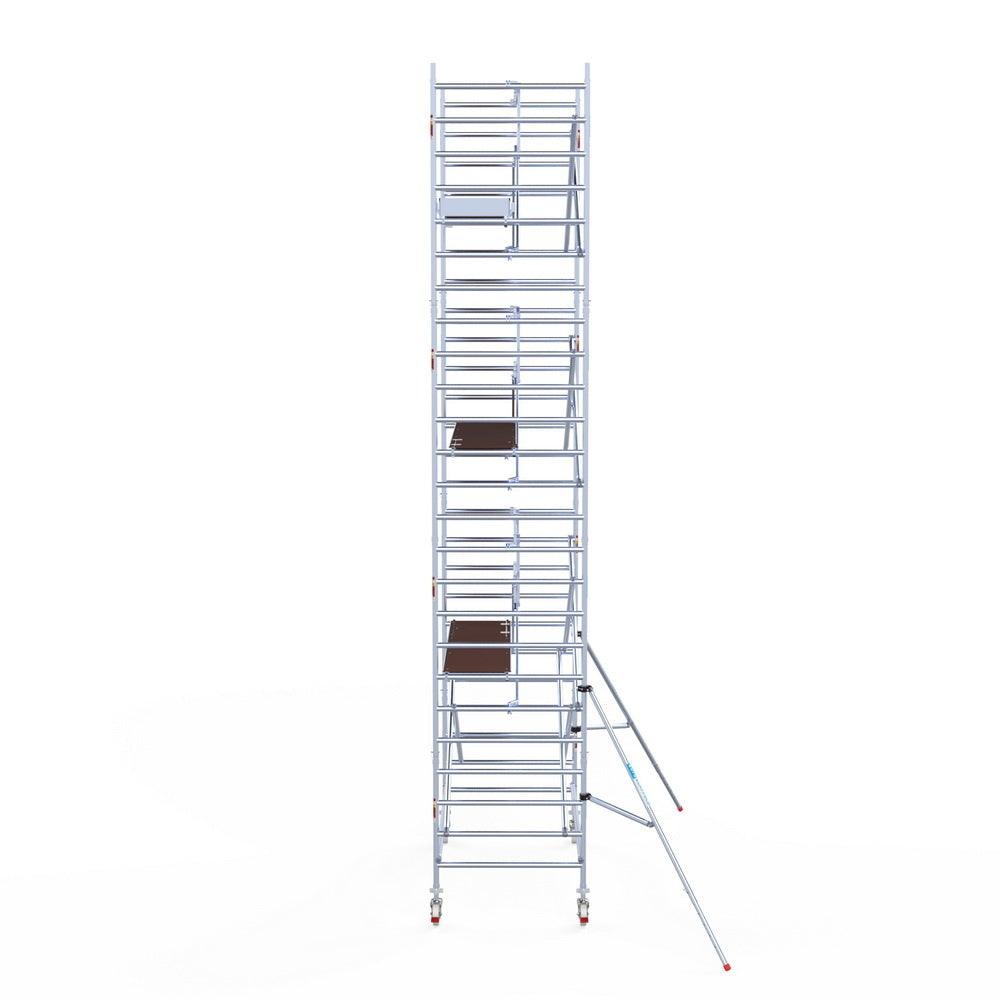 Unsere Rollgerüste sind in verschiedenen Breiten erhältlich, typischerweise 75 cm, 90 cm und 135 cm, abhängig vom jeweiligen Modell und der Produktlinie (semi-professionell oder professionell). Die 75 cm Breite ist ideal für beengte Räume, während 135 cm maximale Arbeitsfläche bietet.