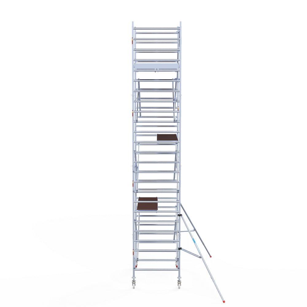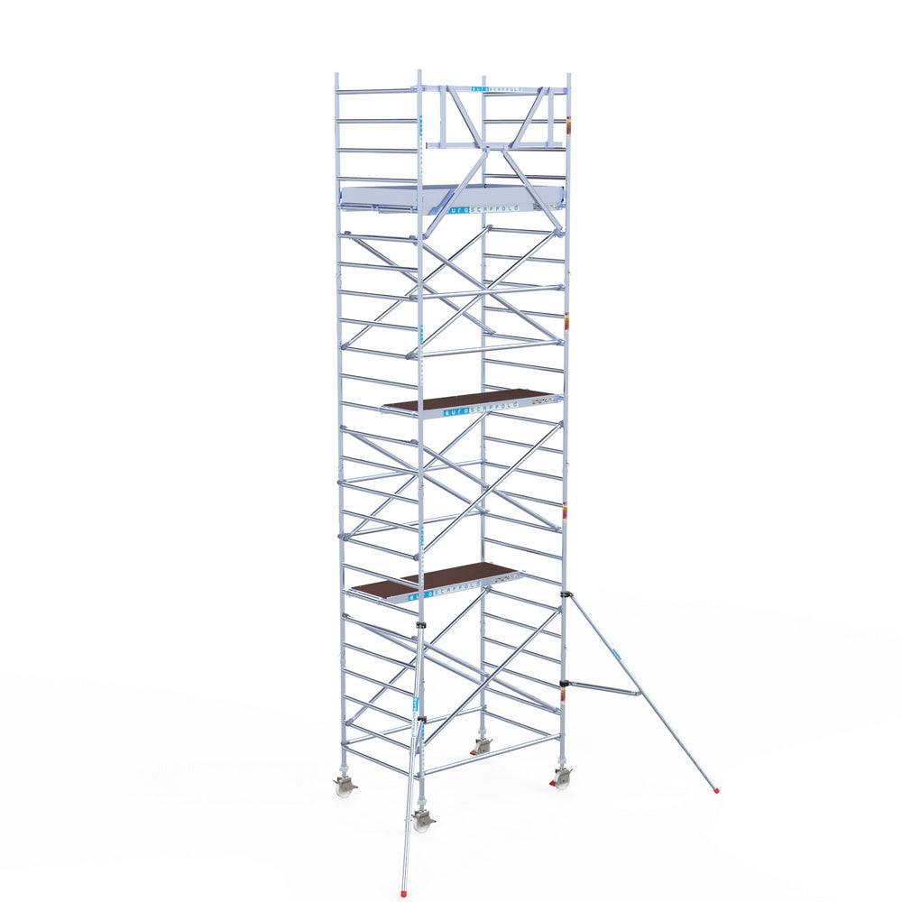Unsere Rollgerüste sind in verschiedenen Breiten erhältlich, typischerweise 75 cm, 90 cm und 135 cm, abhängig vom jeweiligen Modell und der Produktlinie (semi-professionell oder professionell). Die 75 cm Breite ist ideal für beengte Räume, während 135 cm maximale Arbeitsfläche bietet.