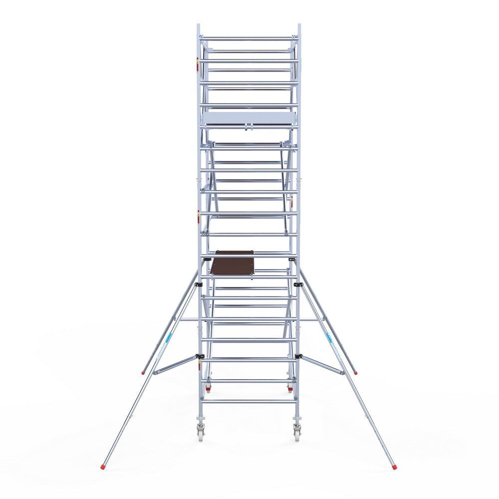 Unsere Rollgerüste sind in verschiedenen Breiten erhältlich, typischerweise 75 cm, 90 cm und 135 cm, abhängig vom jeweiligen Modell und der Produktlinie (semi-professionell oder professionell). Die 75 cm Breite ist ideal für beengte Räume, während 135 cm maximale Arbeitsfläche bietet.