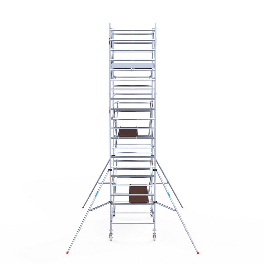 Unsere Rollgerüste sind in verschiedenen Breiten erhältlich, typischerweise 75 cm, 90 cm und 135 cm, abhängig vom jeweiligen Modell und der Produktlinie (semi-professionell oder professionell). Die 75 cm Breite ist ideal für beengte Räume, während 135 cm maximale Arbeitsfläche bietet.