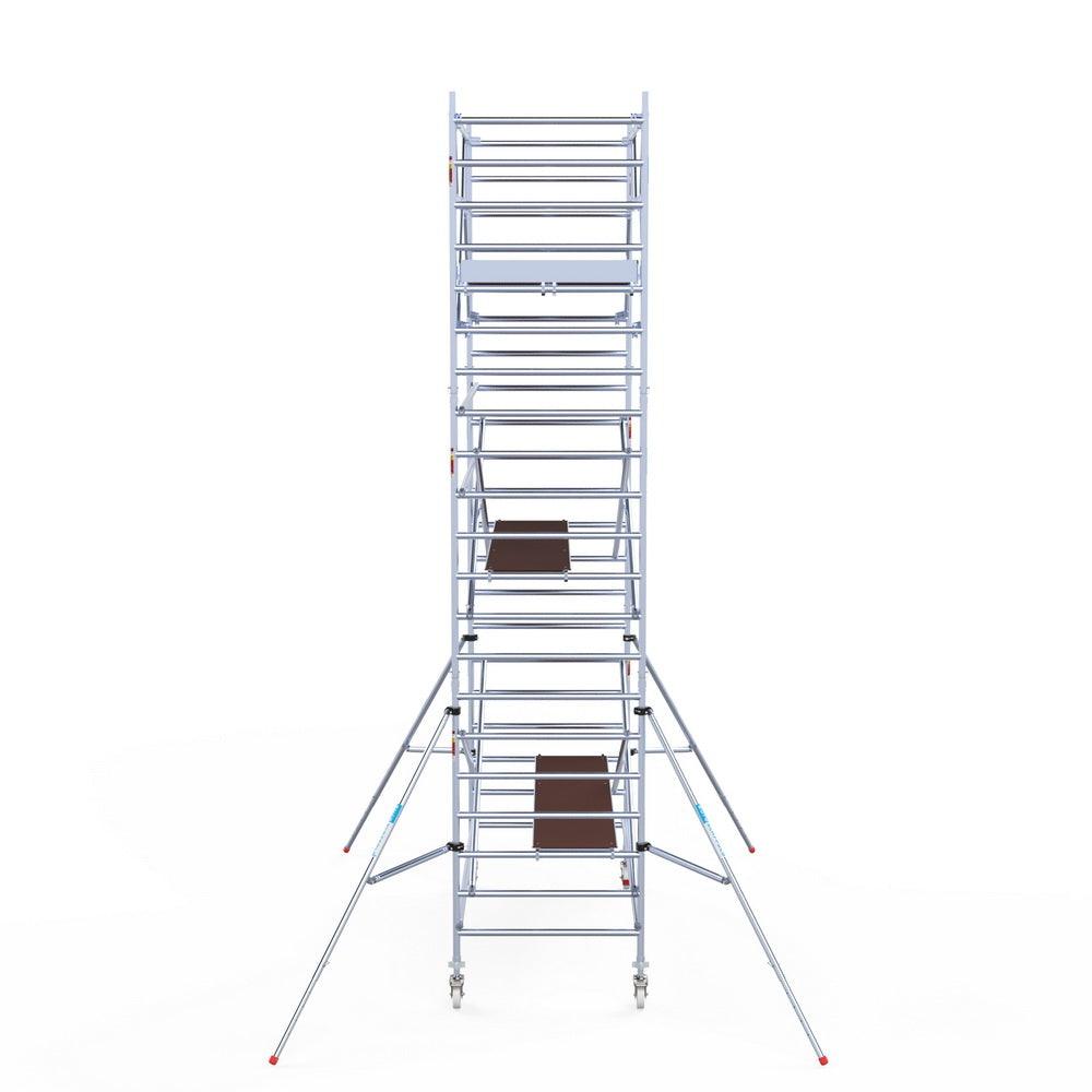 Unsere Rollgerüste sind in verschiedenen Breiten erhältlich, typischerweise 75 cm, 90 cm und 135 cm, abhängig vom jeweiligen Modell und der Produktlinie (semi-professionell oder professionell). Die 75 cm Breite ist ideal für beengte Räume, während 135 cm maximale Arbeitsfläche bietet.