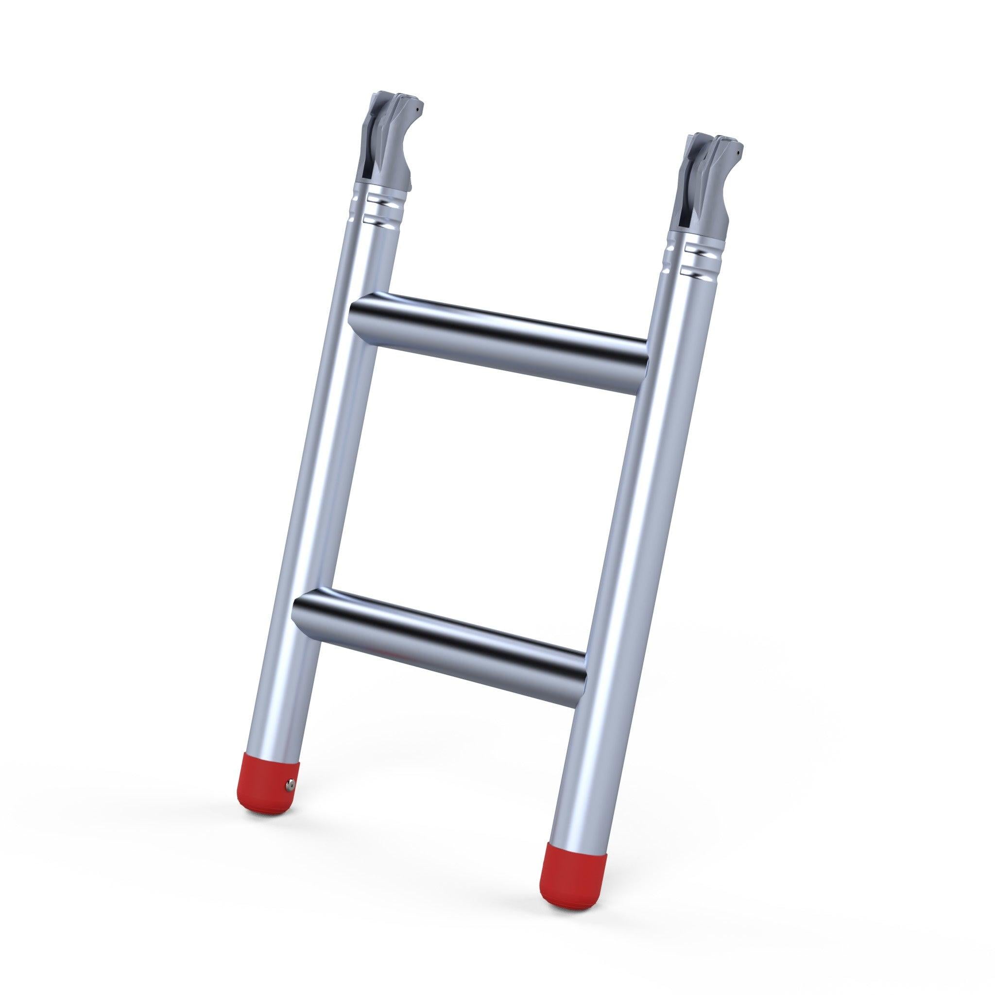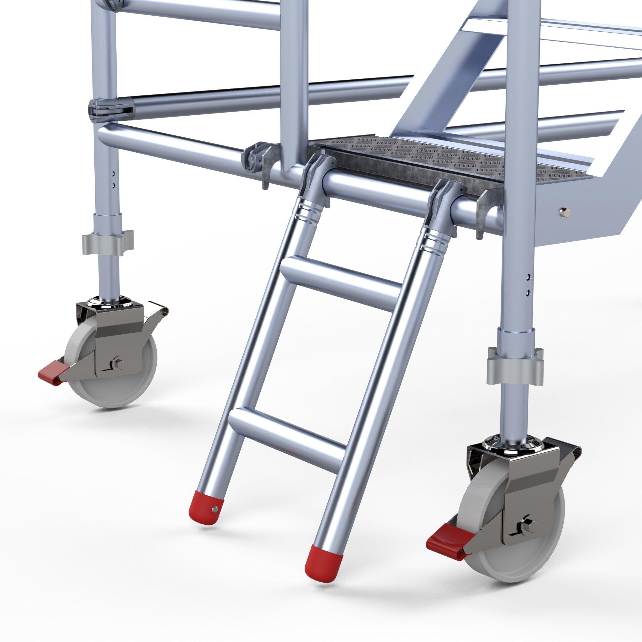 Wenn das (Roll-)Gerüst auf seinen Rädern oder Spindeln hoch steht, kann zwischen dem Gerüst und der Oberfläche ein ziemlicher Spalt entstehen. Mit dieser Treppenkonsole der niederländischen Marke Euroscaffold wird die Stufe zwischen der Oberfläche und dem Treppenturm noch kleiner.