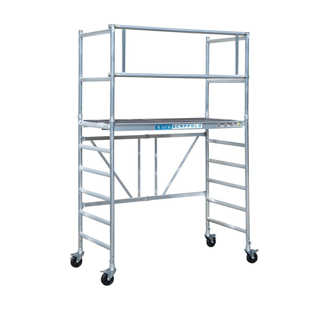 Das benutzerfreundliche und kompakte Zimmergerüst von Euroscaffold ist für den professionellen Einsatz im Innen- und Außenbereich geeignet. Das leichte Gerüst ist sicher im Gebrauch und leicht zu bewegen. Mit der 30 cm langen Zusatzplattform können Sie problemlos auf die darüber liegende Plattform steigen. Sie können diese zusätzliche Plattform auch als breite Arbeitsfläche und Werkbank verwenden. Das Gerüst ist aus hochwertigem Aluminium gefertigt und die Sprossen sind mit einem Anti-Rutsch-Profil ausgestattet. Die Plattform hat einen geschweißten Aluminiumrahmen mit wasserfestem Sperrholz und einer Anti-Rutsch-Beschichtung. Das Zimmergerüst kann mit 2 Geländerrahmen und einer doppelten horizontalen Strebe von 90 cm Breite für eine größere Arbeitshöhe erweitert werden. Das Gerüst erfüllt die gesetzlichen Normen und Anforderungen für den professionellen Einsatz.
