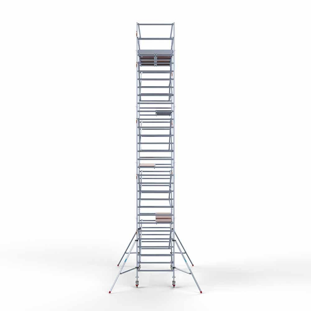 Unsere Rollgerüste sind in verschiedenen Breiten erhältlich, typischerweise 75 cm, 90 cm und 135 cm, abhängig vom jeweiligen Modell und der Produktlinie (semi-professionell oder professionell). Die 75 cm Breite ist ideal für beengte Räume, während 135 cm maximale Arbeitsfläche bietet.