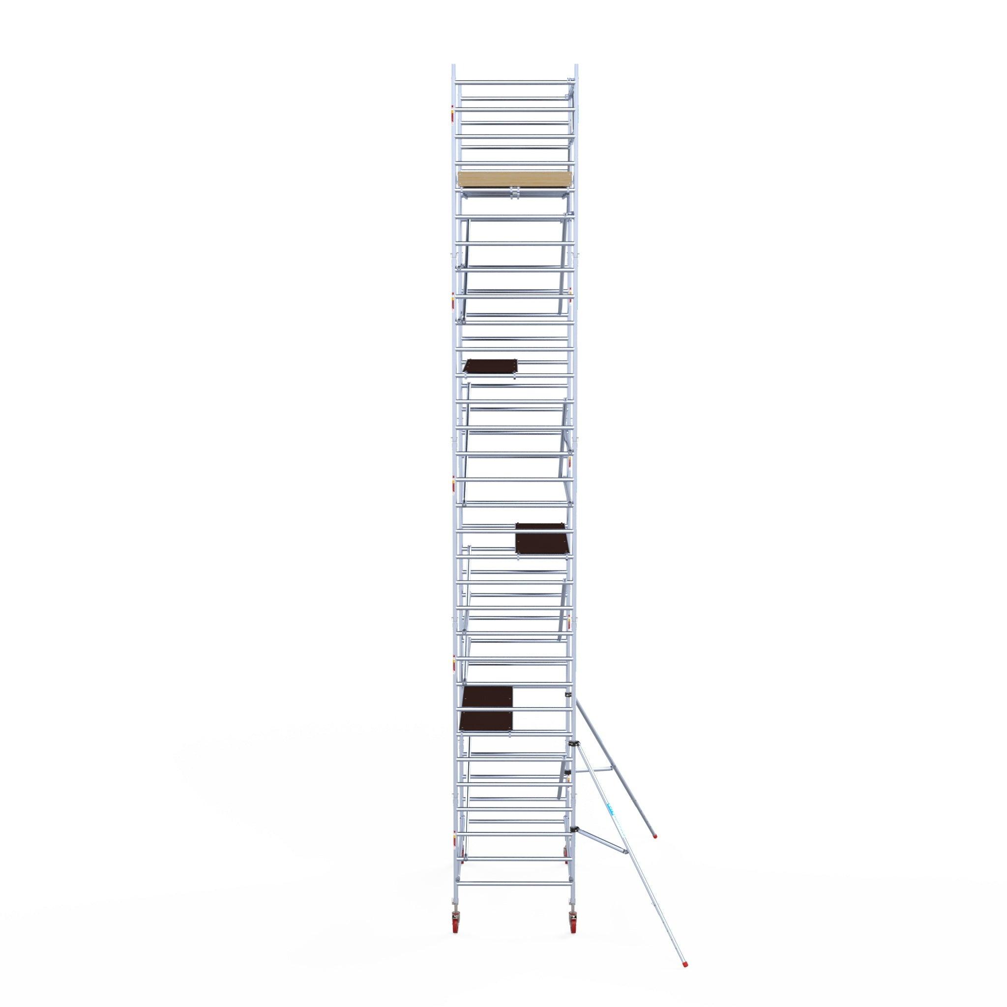 Unsere Rollgerüste sind in verschiedenen Breiten erhältlich, typischerweise 75 cm, 90 cm und 135 cm, abhängig vom jeweiligen Modell und der Produktlinie (semi-professionell oder professionell). Die 75 cm Breite ist ideal für beengte Räume, während 135 cm maximale Arbeitsfläche bietet.