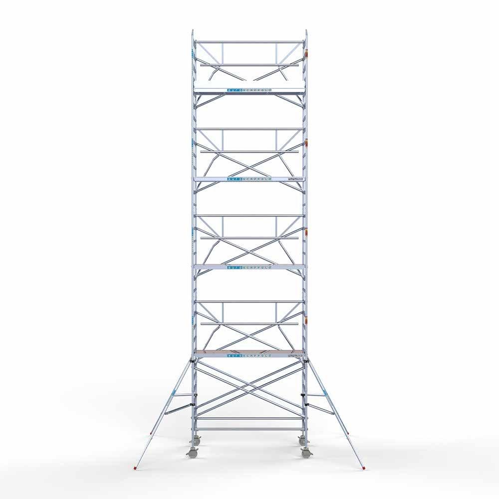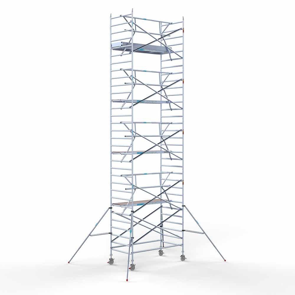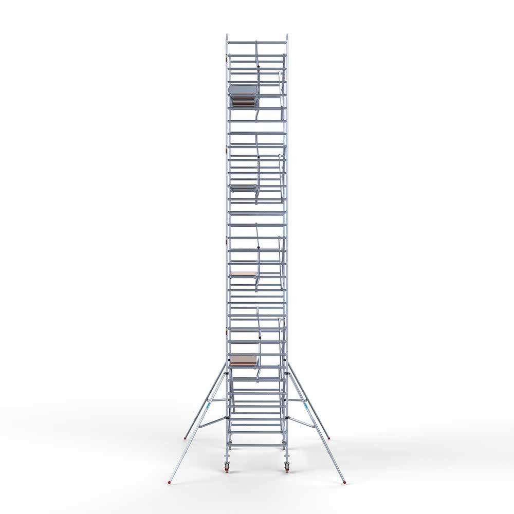 Unsere Rollgerüste sind in verschiedenen Breiten erhältlich, typischerweise 75 cm, 90 cm und 135 cm, abhängig vom jeweiligen Modell und der Produktlinie (semi-professionell oder professionell). Die 75 cm Breite ist ideal für beengte Räume, während 135 cm maximale Arbeitsfläche bietet.