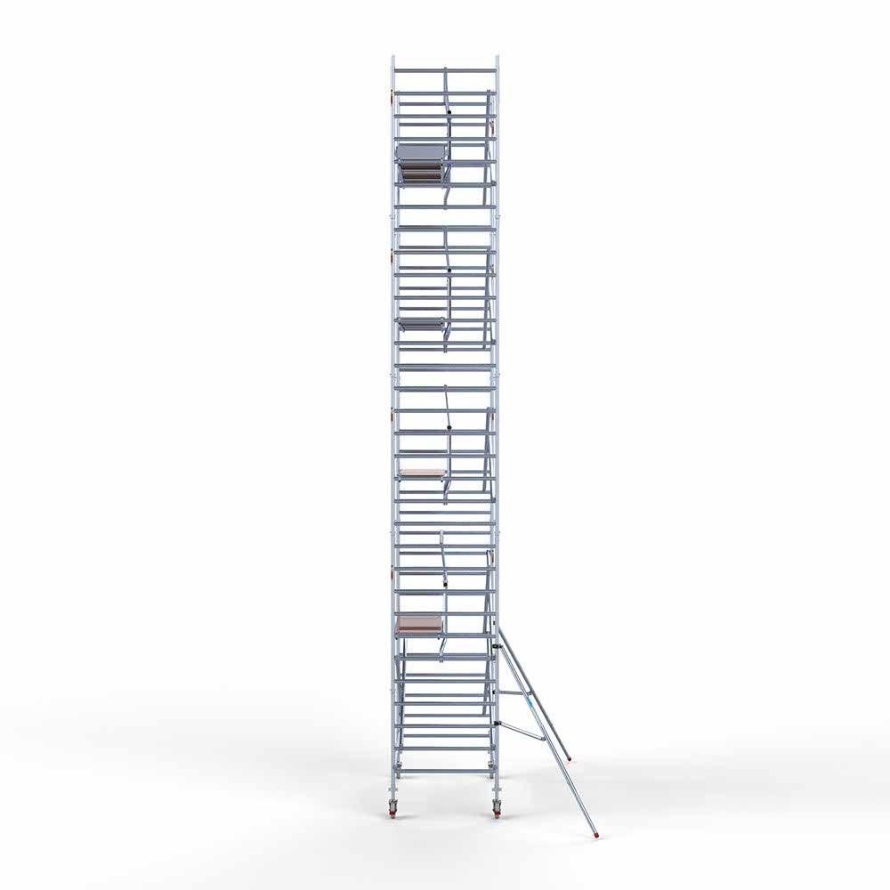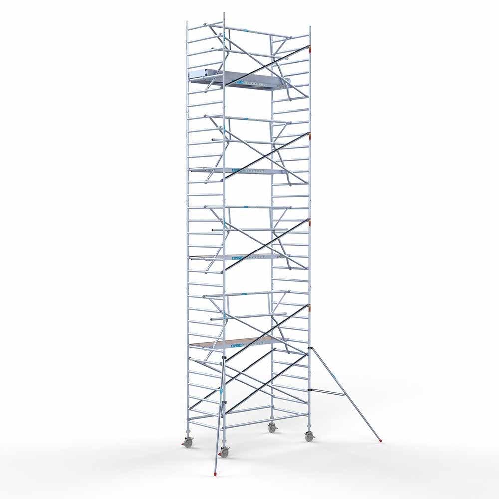 Unsere Rollgerüste sind in verschiedenen Breiten erhältlich, typischerweise 75 cm, 90 cm und 135 cm, abhängig vom jeweiligen Modell und der Produktlinie (semi-professionell oder professionell). Die 75 cm Breite ist ideal für beengte Räume, während 135 cm maximale Arbeitsfläche bietet.