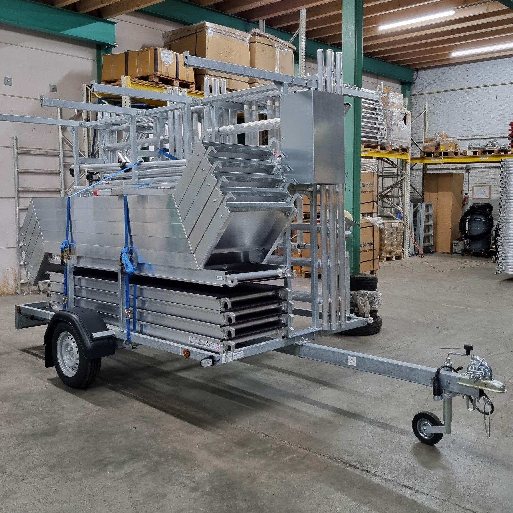 The stair tower comes with a matching trailer on which each component has its own place so that everything stays well organized.