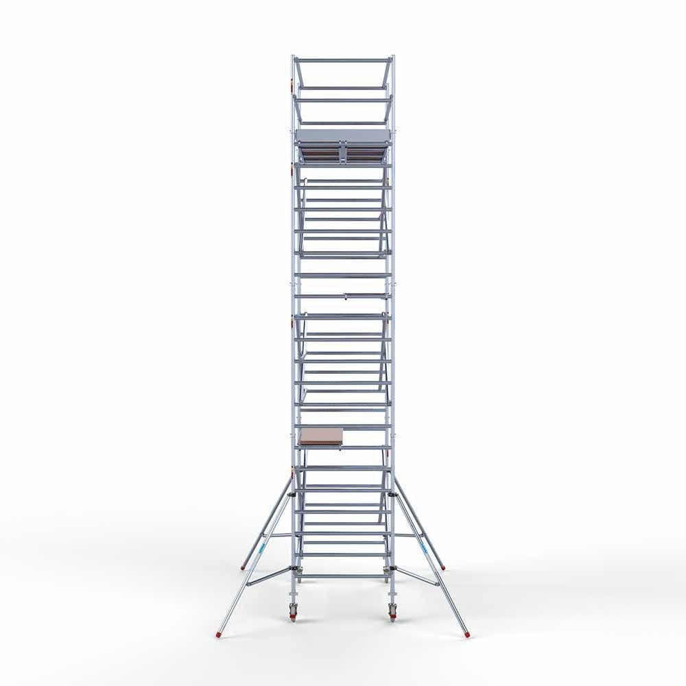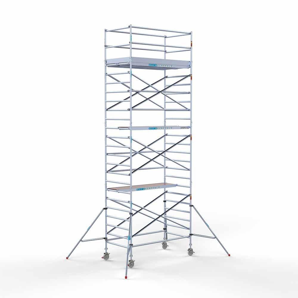Unsere Rollgerüste sind in verschiedenen Breiten erhältlich, typischerweise 75 cm, 90 cm und 135 cm, abhängig vom jeweiligen Modell und der Produktlinie (semi-professionell oder professionell). Die 75 cm Breite ist ideal für beengte Räume, während 135 cm maximale Arbeitsfläche bietet.