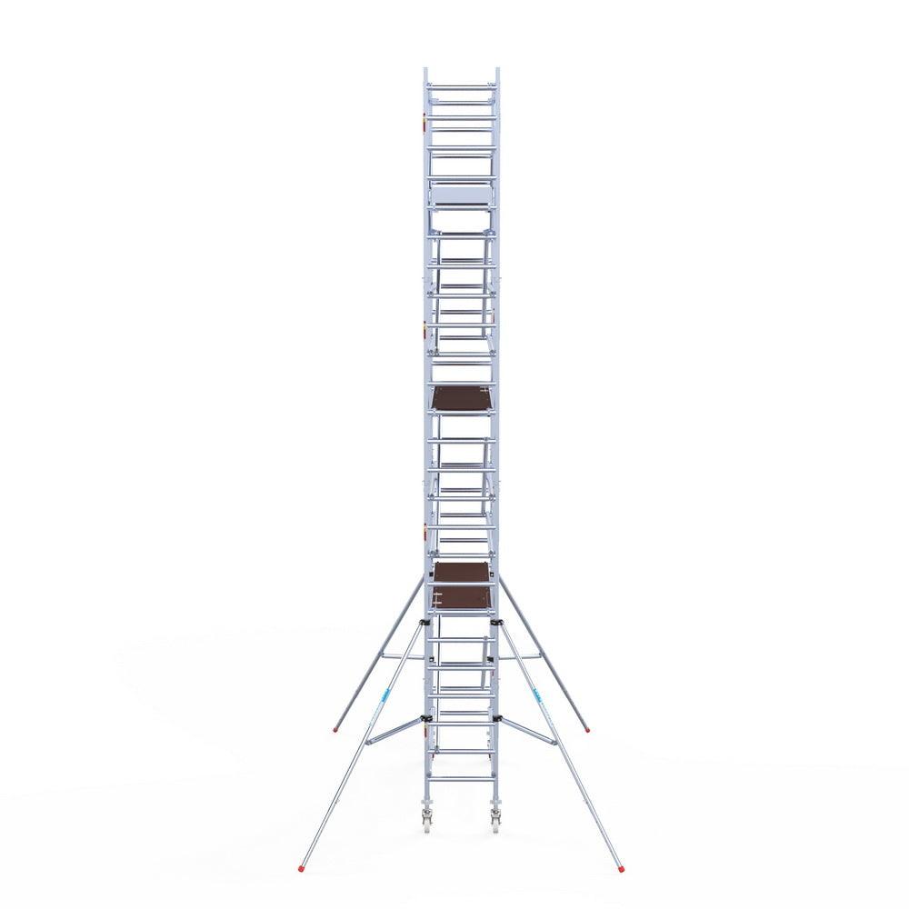 Unsere Rollgerüste sind in verschiedenen Breiten erhältlich, typischerweise 75 cm, 90 cm und 135 cm, abhängig vom jeweiligen Modell und der Produktlinie (semi-professionell oder professionell). Die 75 cm Breite ist ideal für beengte Räume, während 135 cm maximale Arbeitsfläche bietet.