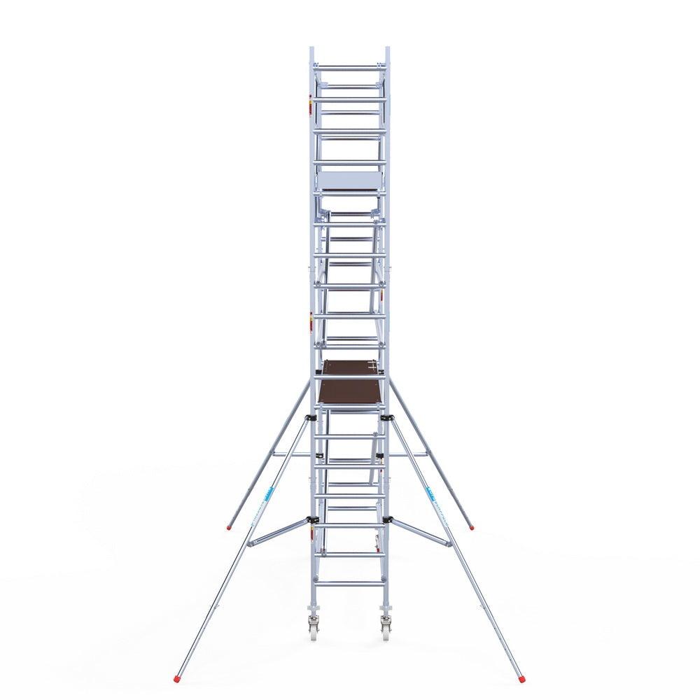 Unsere Rollgerüste sind in verschiedenen Breiten erhältlich, typischerweise 75 cm, 90 cm und 135 cm, abhängig vom jeweiligen Modell und der Produktlinie (semi-professionell oder professionell). Die 75 cm Breite ist ideal für beengte Räume, während 135 cm maximale Arbeitsfläche bietet.