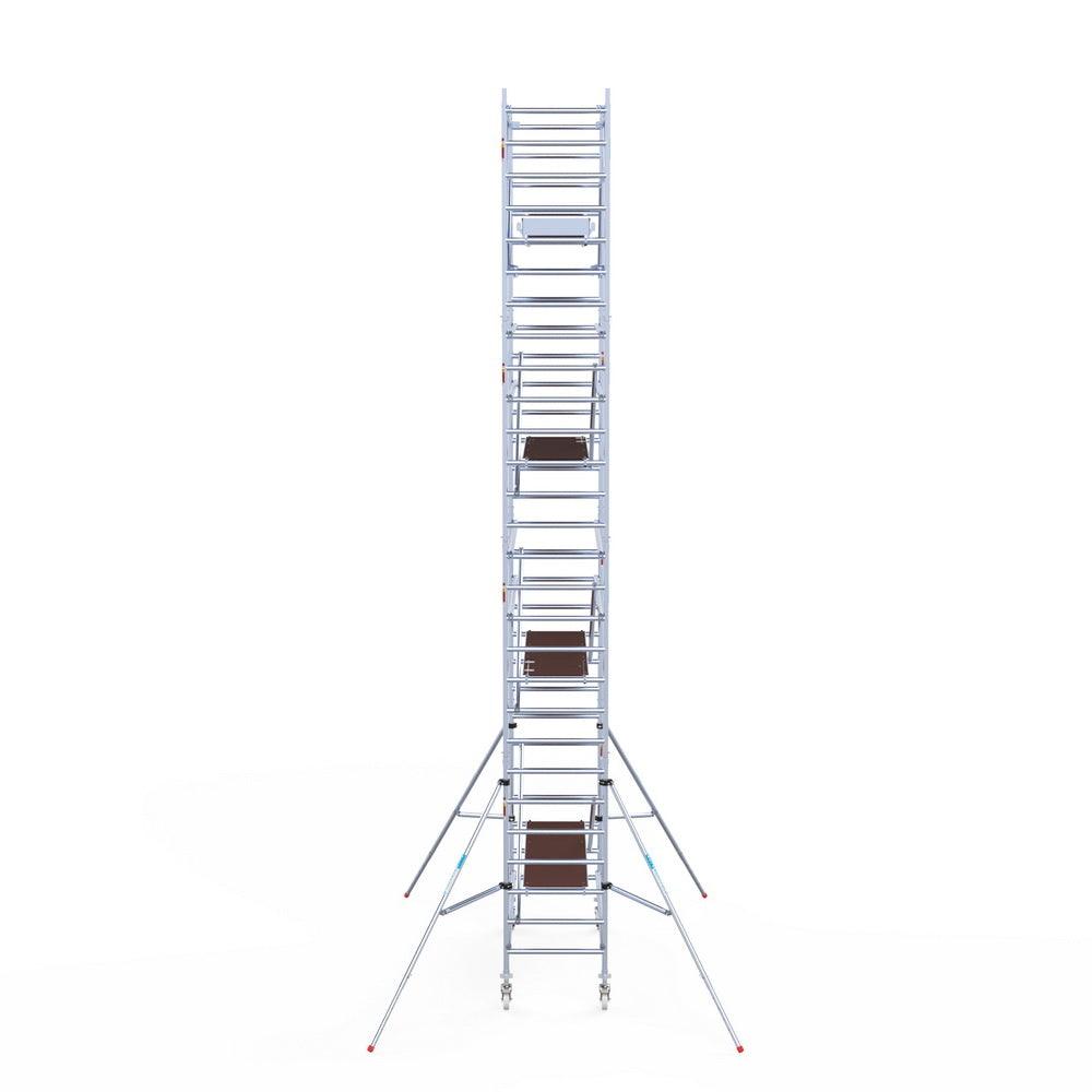 Unsere Rollgerüste sind in verschiedenen Breiten erhältlich, typischerweise 75 cm, 90 cm und 135 cm, abhängig vom jeweiligen Modell und der Produktlinie (semi-professionell oder professionell). Die 75 cm Breite ist ideal für beengte Räume, während 135 cm maximale Arbeitsfläche bietet.