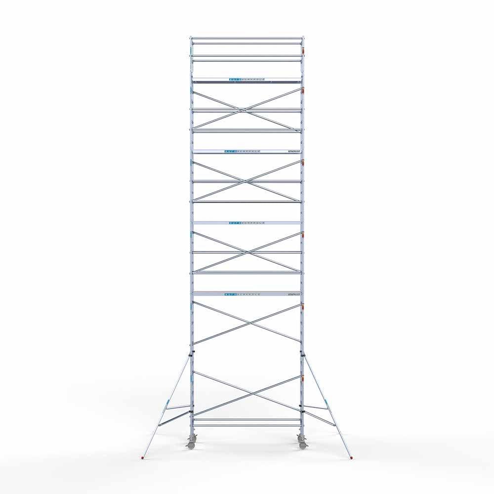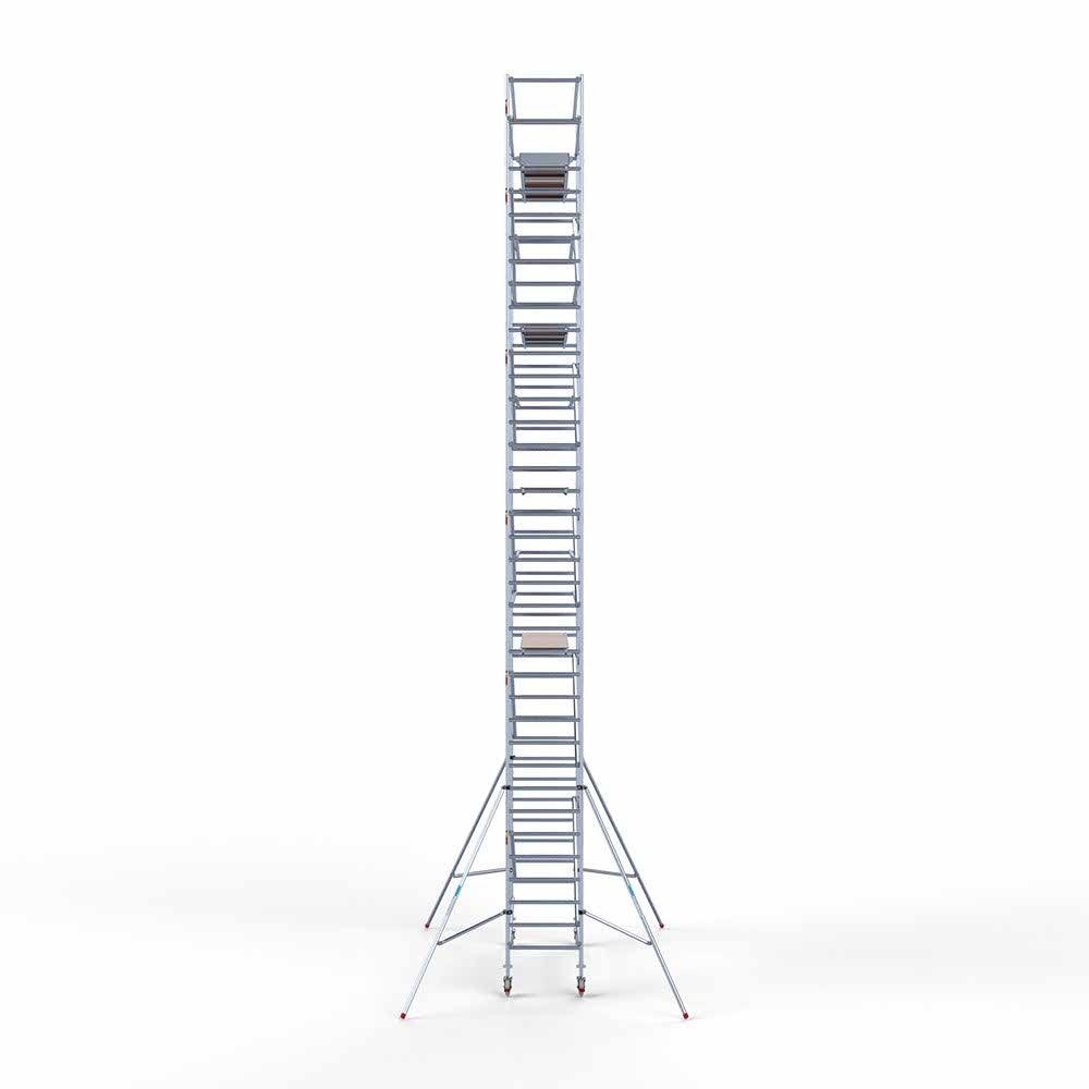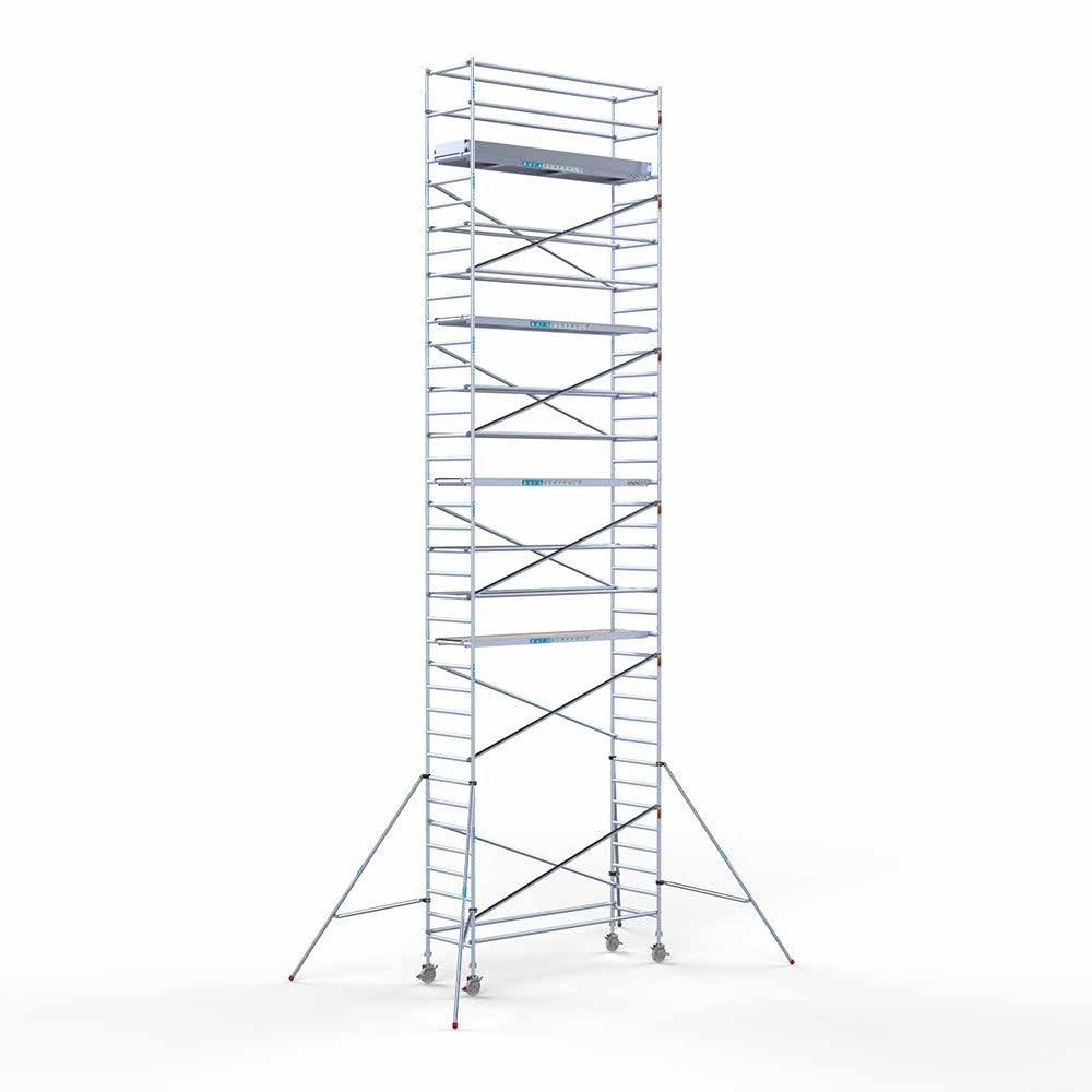 Unsere Rollgerüste sind in verschiedenen Breiten erhältlich, typischerweise 75 cm, 90 cm und 135 cm, abhängig vom jeweiligen Modell und der Produktlinie (semi-professionell oder professionell). Die 75 cm Breite ist ideal für beengte Räume, während 135 cm maximale Arbeitsfläche bietet.