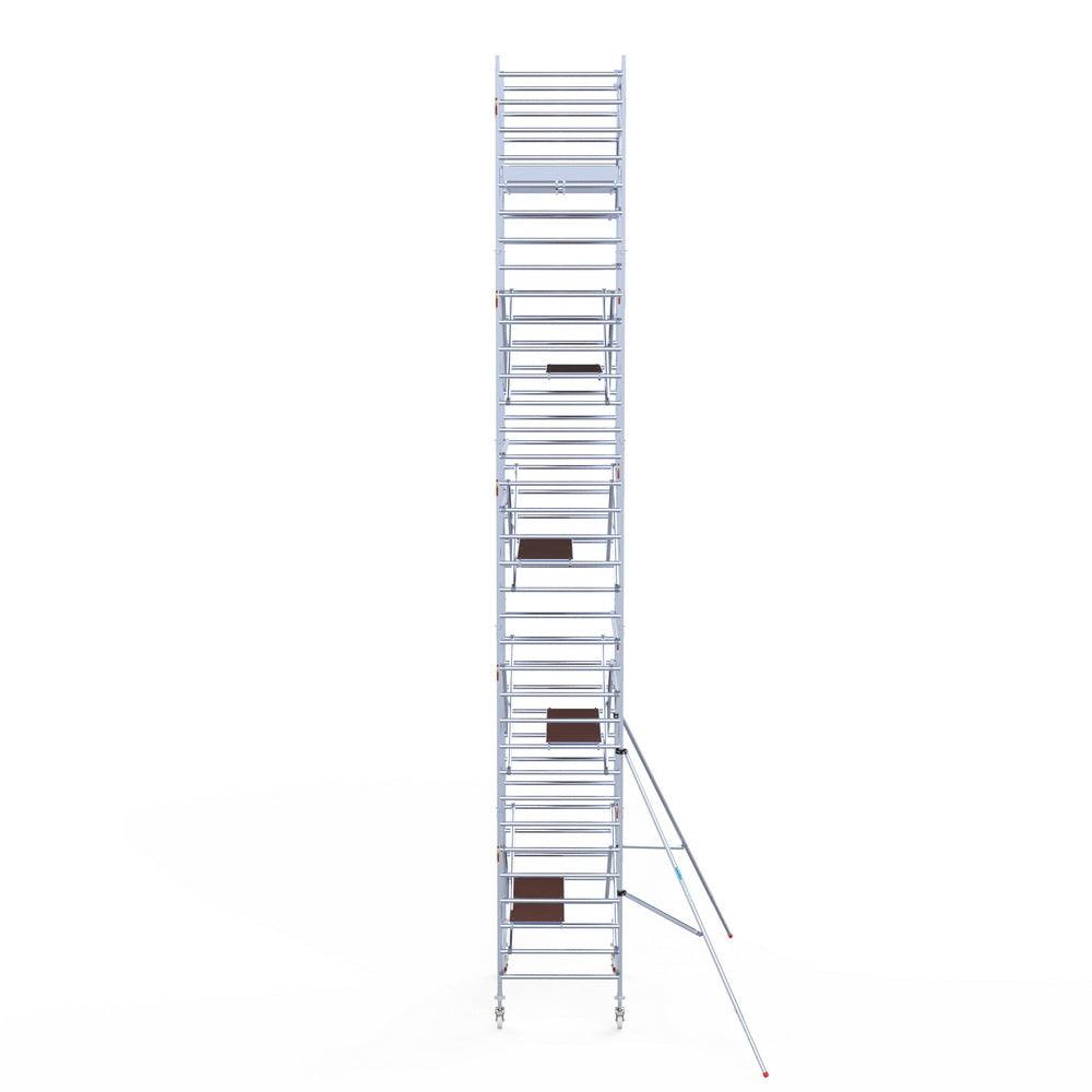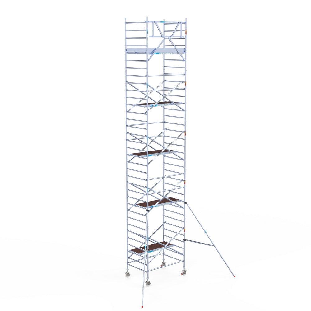Unsere Rollgerüste sind in verschiedenen Breiten erhältlich, typischerweise 75 cm, 90 cm und 135 cm, abhängig vom jeweiligen Modell und der Produktlinie (semi-professionell oder professionell). Die 75 cm Breite ist ideal für beengte Räume, während 135 cm maximale Arbeitsfläche bietet.
