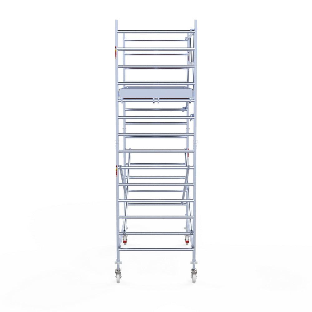 Unsere Rollgerüste sind in verschiedenen Breiten erhältlich, typischerweise 75 cm, 90 cm und 135 cm, abhängig vom jeweiligen Modell und der Produktlinie (semi-professionell oder professionell). Die 75 cm Breite ist ideal für beengte Räume, während 135 cm maximale Arbeitsfläche bietet.