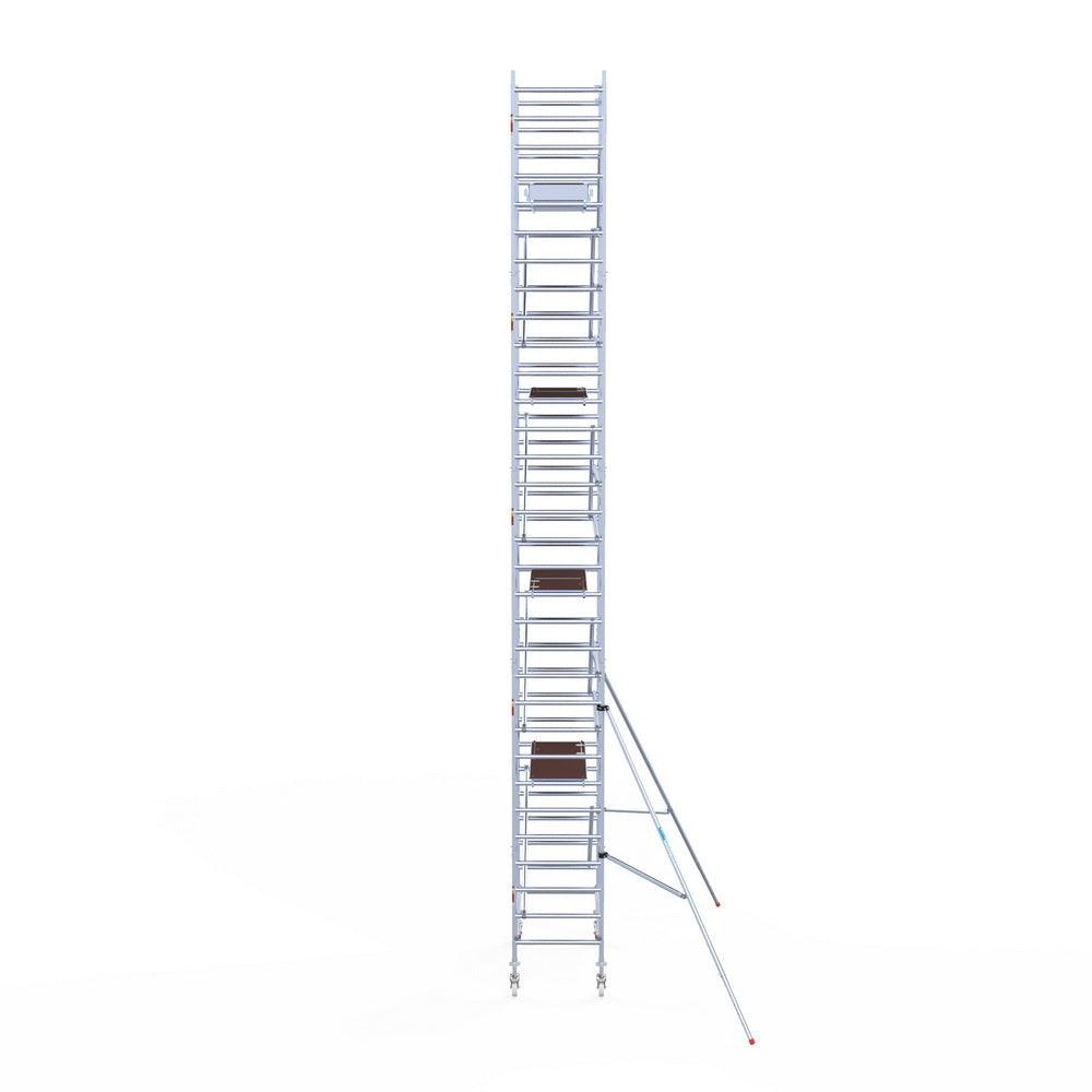 Unsere Rollgerüste sind in verschiedenen Breiten erhältlich, typischerweise 75 cm, 90 cm und 135 cm, abhängig vom jeweiligen Modell und der Produktlinie (semi-professionell oder professionell). Die 75 cm Breite ist ideal für beengte Räume, während 135 cm maximale Arbeitsfläche bietet.