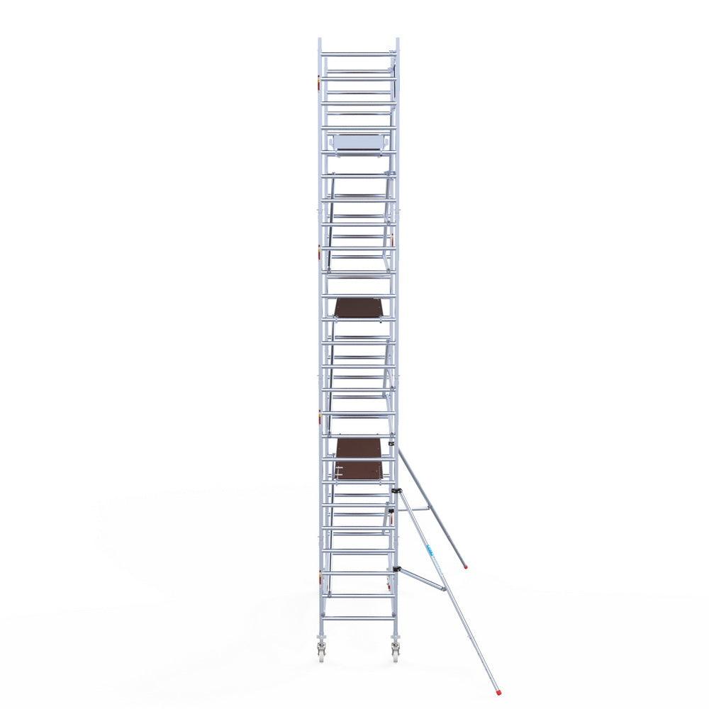 Unsere Rollgerüste sind in verschiedenen Breiten erhältlich, typischerweise 75 cm, 90 cm und 135 cm, abhängig vom jeweiligen Modell und der Produktlinie (semi-professionell oder professionell). Die 75 cm Breite ist ideal für beengte Räume, während 135 cm maximale Arbeitsfläche bietet.