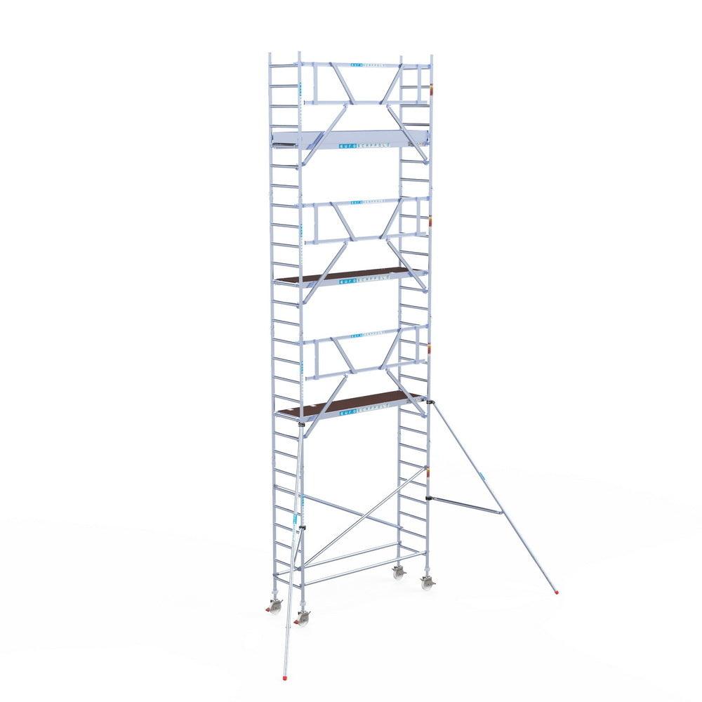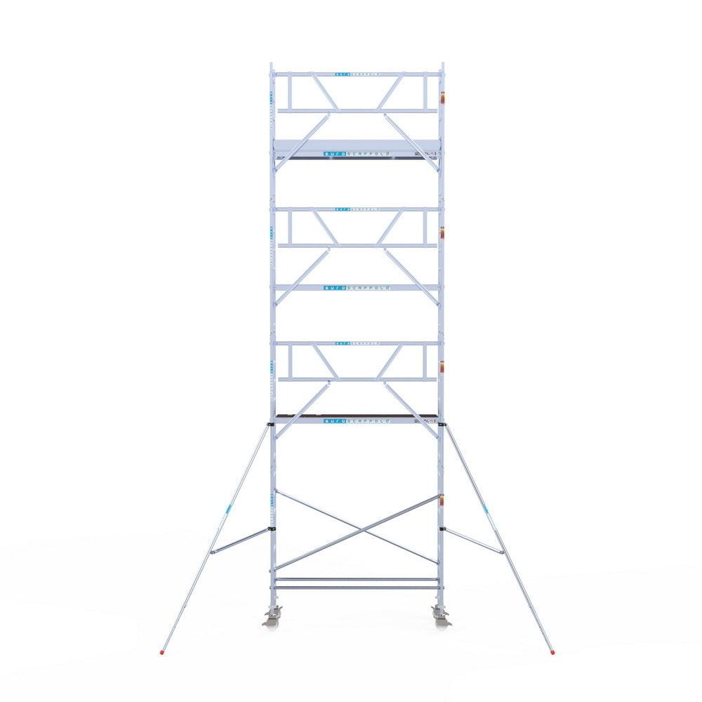 Unsere Rollgerüste sind in verschiedenen Breiten erhältlich, typischerweise 75 cm, 90 cm und 135 cm, abhängig vom jeweiligen Modell und der Produktlinie (semi-professionell oder professionell). Die 75 cm Breite ist ideal für beengte Räume, während 135 cm maximale Arbeitsfläche bietet.