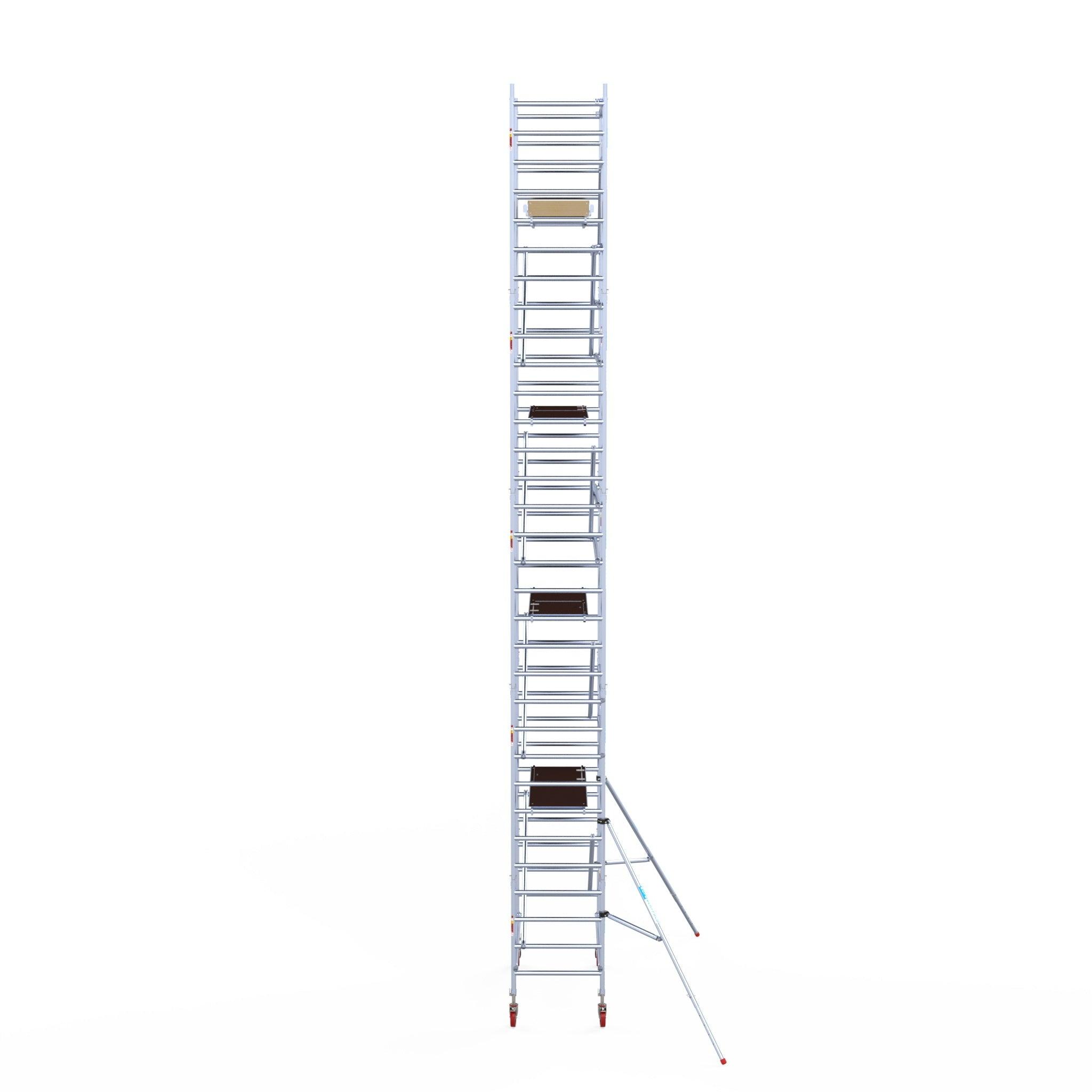 Unsere Rollgerüste sind in verschiedenen Breiten erhältlich, typischerweise 75 cm, 90 cm und 135 cm, abhängig vom jeweiligen Modell und der Produktlinie (semi-professionell oder professionell). Die 75 cm Breite ist ideal für beengte Räume, während 135 cm maximale Arbeitsfläche bietet.