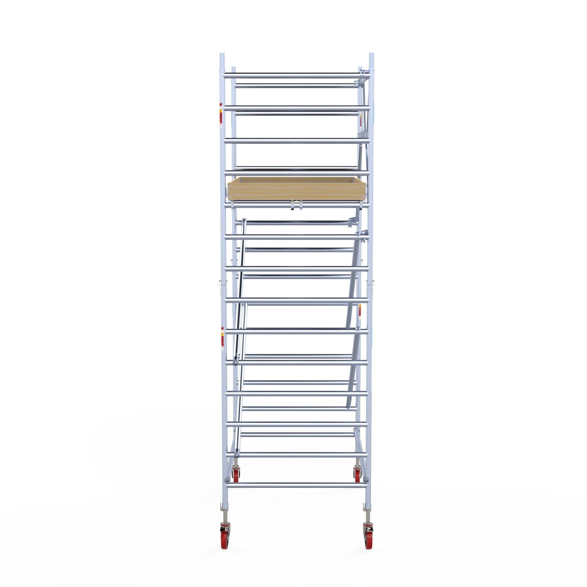 Unsere Rollgerüste sind in verschiedenen Breiten erhältlich, typischerweise 75 cm, 90 cm und 135 cm, abhängig vom jeweiligen Modell und der Produktlinie (semi-professionell oder professionell). Die 75 cm Breite ist ideal für beengte Räume, während 135 cm maximale Arbeitsfläche bietet.
