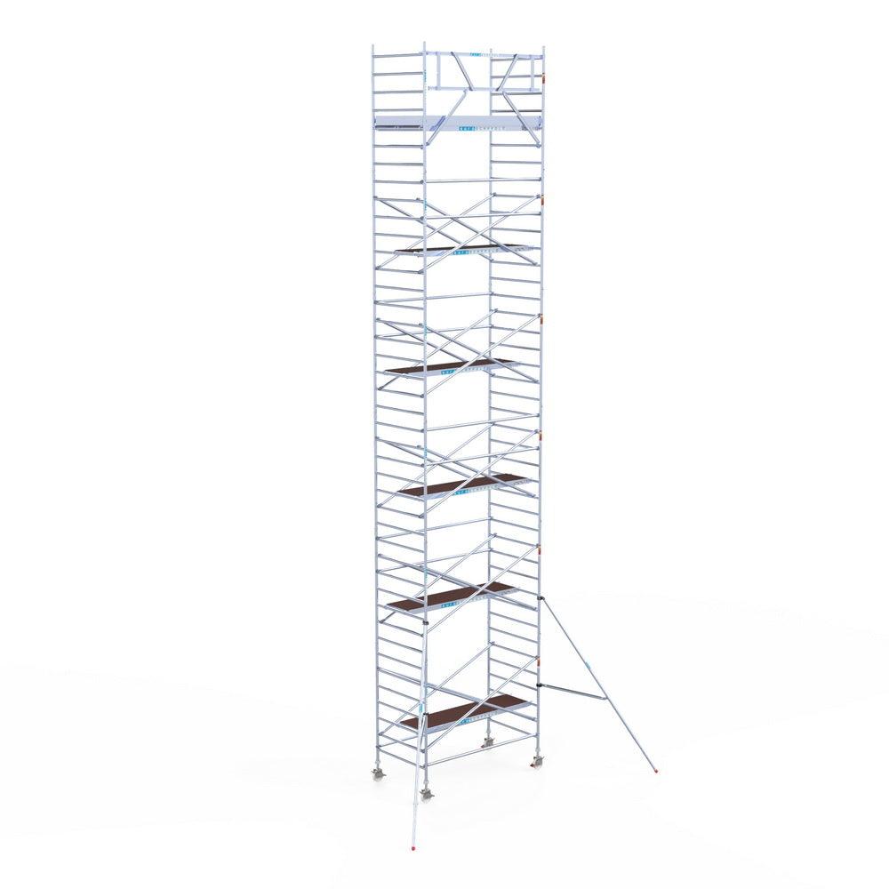 Unsere Rollgerüste sind in verschiedenen Breiten erhältlich, typischerweise 75 cm, 90 cm und 135 cm, abhängig vom jeweiligen Modell und der Produktlinie (semi-professionell oder professionell). Die 75 cm Breite ist ideal für beengte Räume, während 135 cm maximale Arbeitsfläche bietet.