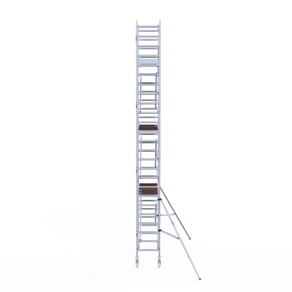 Unsere Rollgerüste sind in verschiedenen Breiten erhältlich, typischerweise 75 cm, 90 cm und 135 cm, abhängig vom jeweiligen Modell und der Produktlinie (semi-professionell oder professionell). Die 75 cm Breite ist ideal für beengte Räume, während 135 cm maximale Arbeitsfläche bietet.