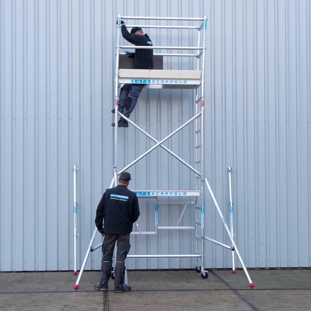 The compact Euroscaffold carpentry scaffold is ideal for working in small rooms and alleys and is suitable for DIY and semi-professional use in and around the house. The foldable scaffold can be easily transported to other rooms thanks to its wheels and narrow width. The scaffold is made of high-quality aluminum and the rungs have a non-slip profile. Stabilizers and toe boards provide additional safety. The platform is equipped with a welded aluminum frame. The carpentry scaffold can be combined with all components from the Euroscaffold 75 series and meets the applicable standards and requirements (Class 2) for self-assembly.