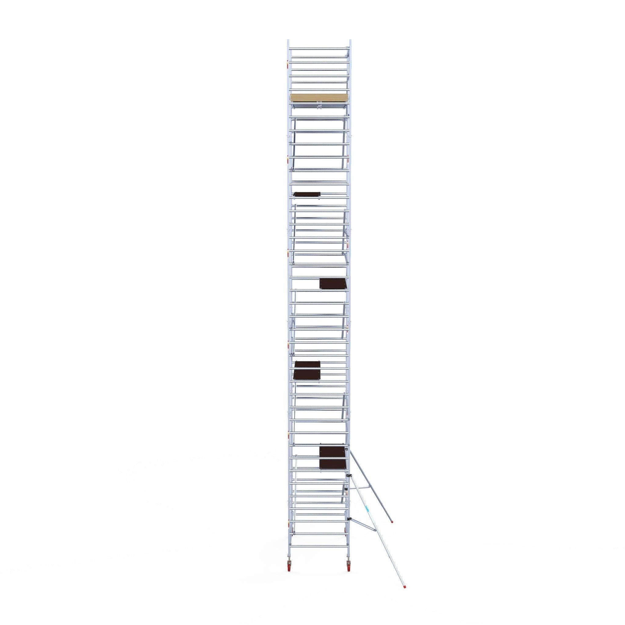 Unsere Rollgerüste sind in verschiedenen Breiten erhältlich, typischerweise 75 cm, 90 cm und 135 cm, abhängig vom jeweiligen Modell und der Produktlinie (semi-professionell oder professionell). Die 75 cm Breite ist ideal für beengte Räume, während 135 cm maximale Arbeitsfläche bietet.