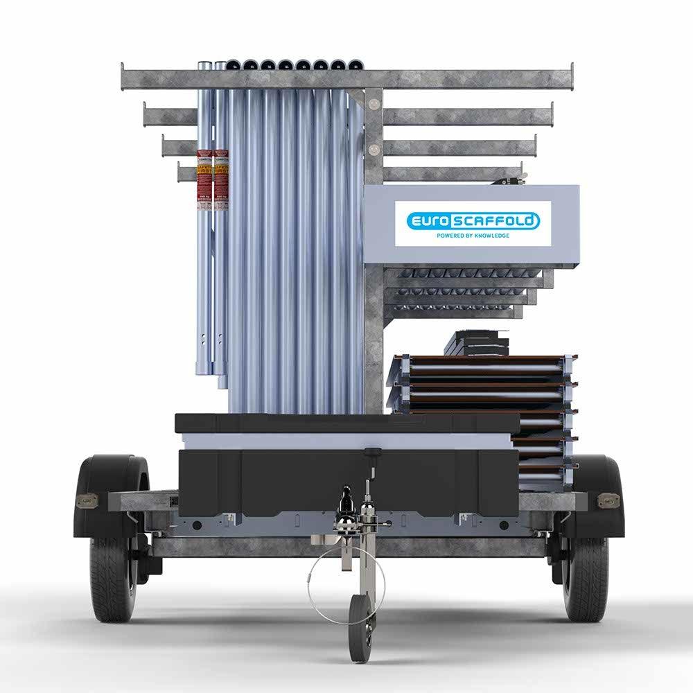 Cette remorque d'échafaudage est fournie avec l'échafaudage mobile Euroscaffold. Elle est spécialement conçue pour un stockage optimal et un transport aisé du matériel d'échafaudage.