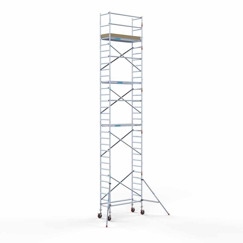 Unsere Rollgerüste sind in verschiedenen Breiten erhältlich, typischerweise 75 cm, 90 cm und 135 cm, abhängig vom jeweiligen Modell und der Produktlinie (semi-professionell oder professionell). Die 75 cm Breite ist ideal für beengte Räume, während 135 cm maximale Arbeitsfläche bietet.