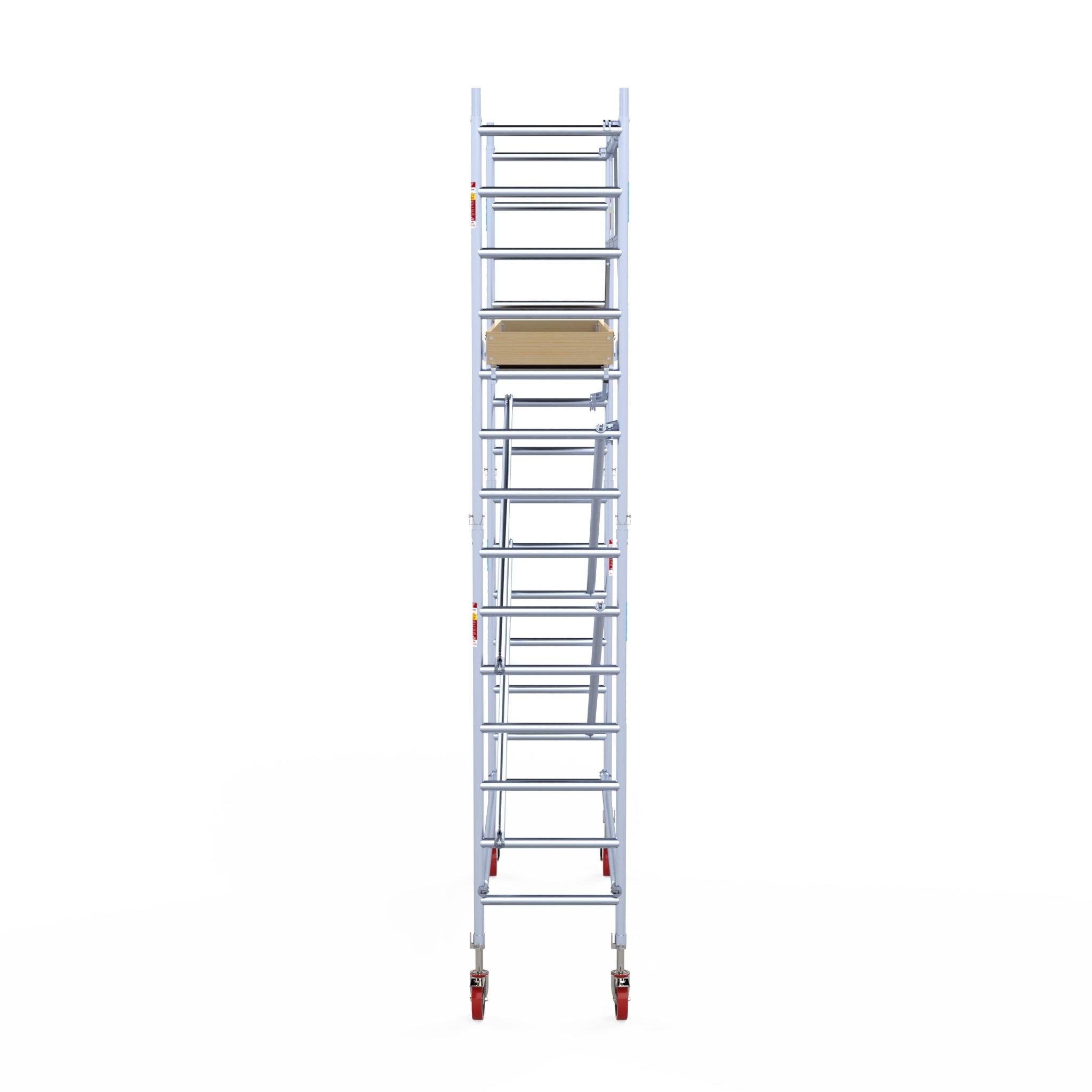 Unsere Rollgerüste sind in verschiedenen Breiten erhältlich, typischerweise 75 cm, 90 cm und 135 cm, abhängig vom jeweiligen Modell und der Produktlinie (semi-professionell oder professionell). Die 75 cm Breite ist ideal für beengte Räume, während 135 cm maximale Arbeitsfläche bietet.
