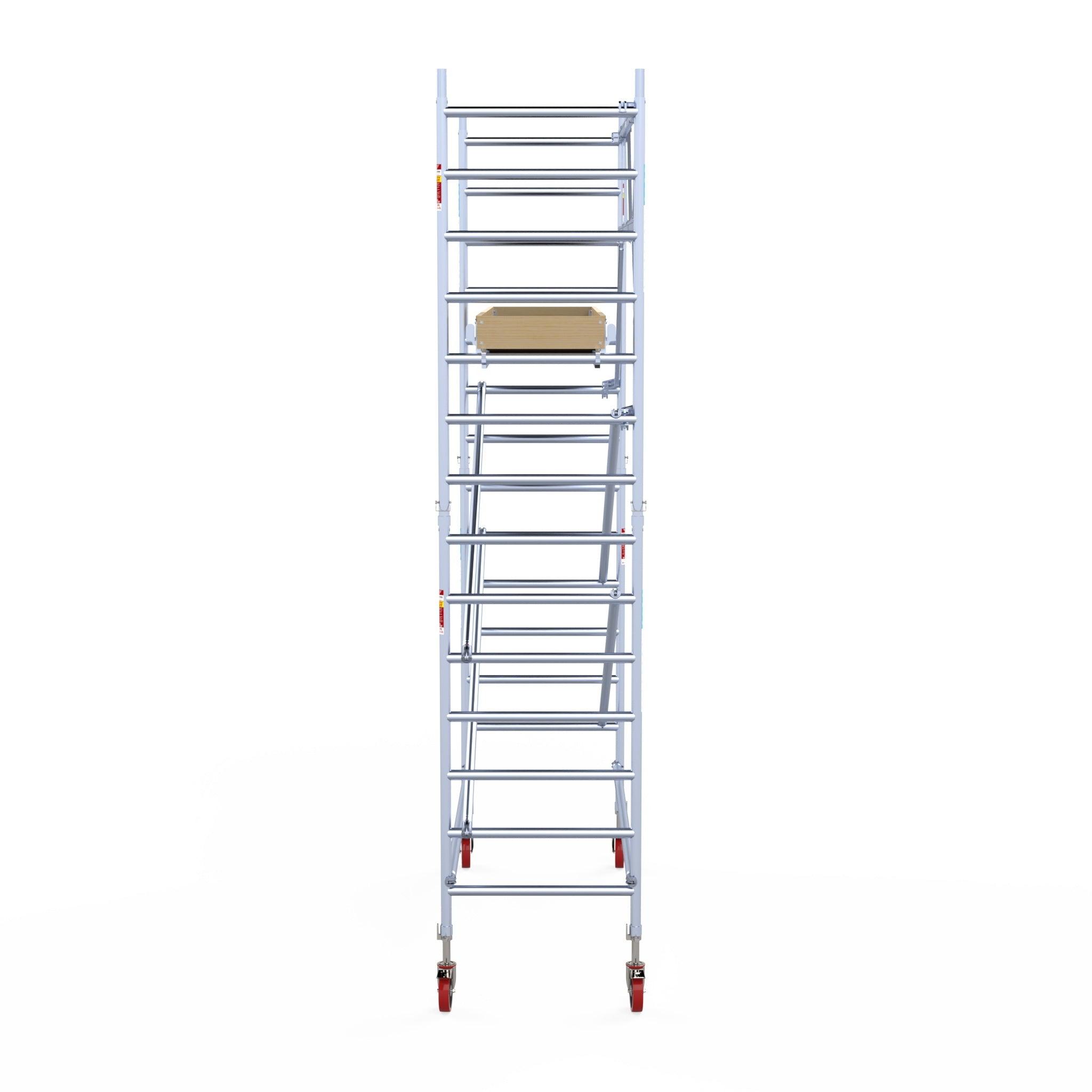 Unsere Rollgerüste sind in verschiedenen Breiten erhältlich, typischerweise 75 cm, 90 cm und 135 cm, abhängig vom jeweiligen Modell und der Produktlinie (semi-professionell oder professionell). Die 75 cm Breite ist ideal für beengte Räume, während 135 cm maximale Arbeitsfläche bietet.
