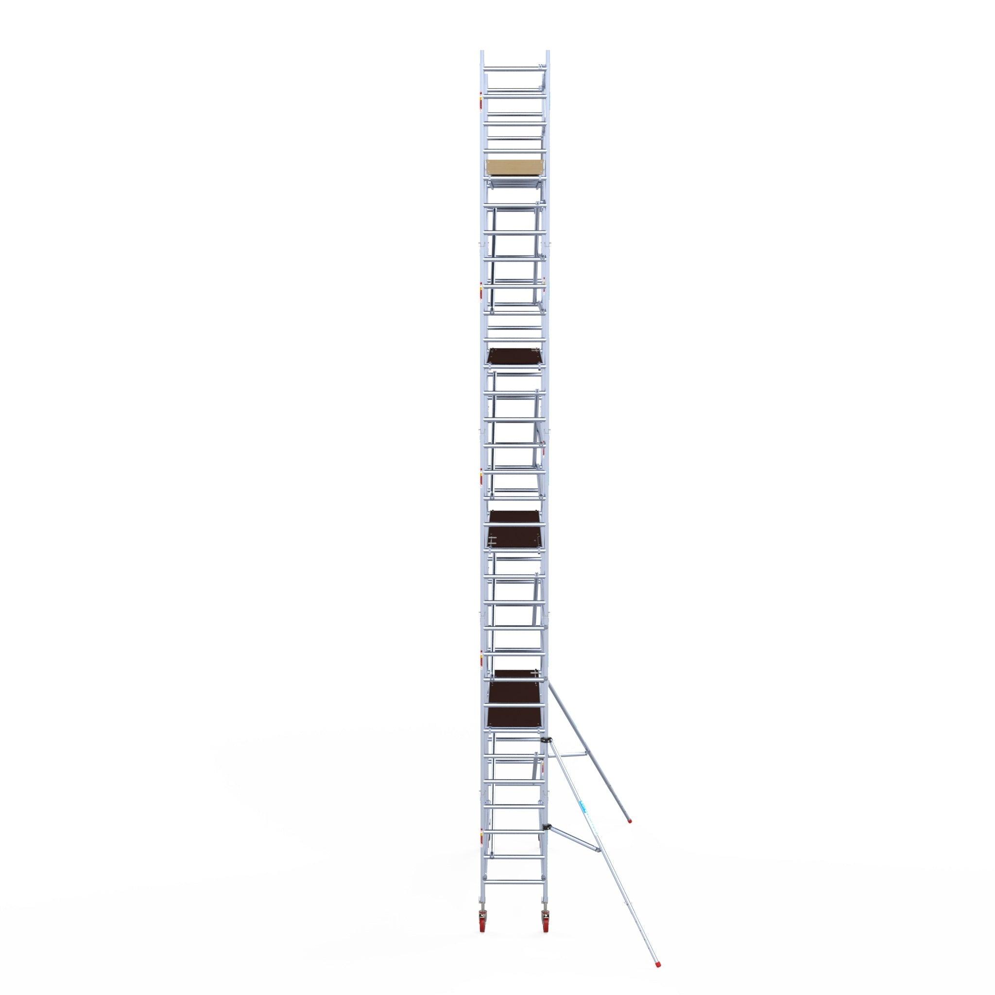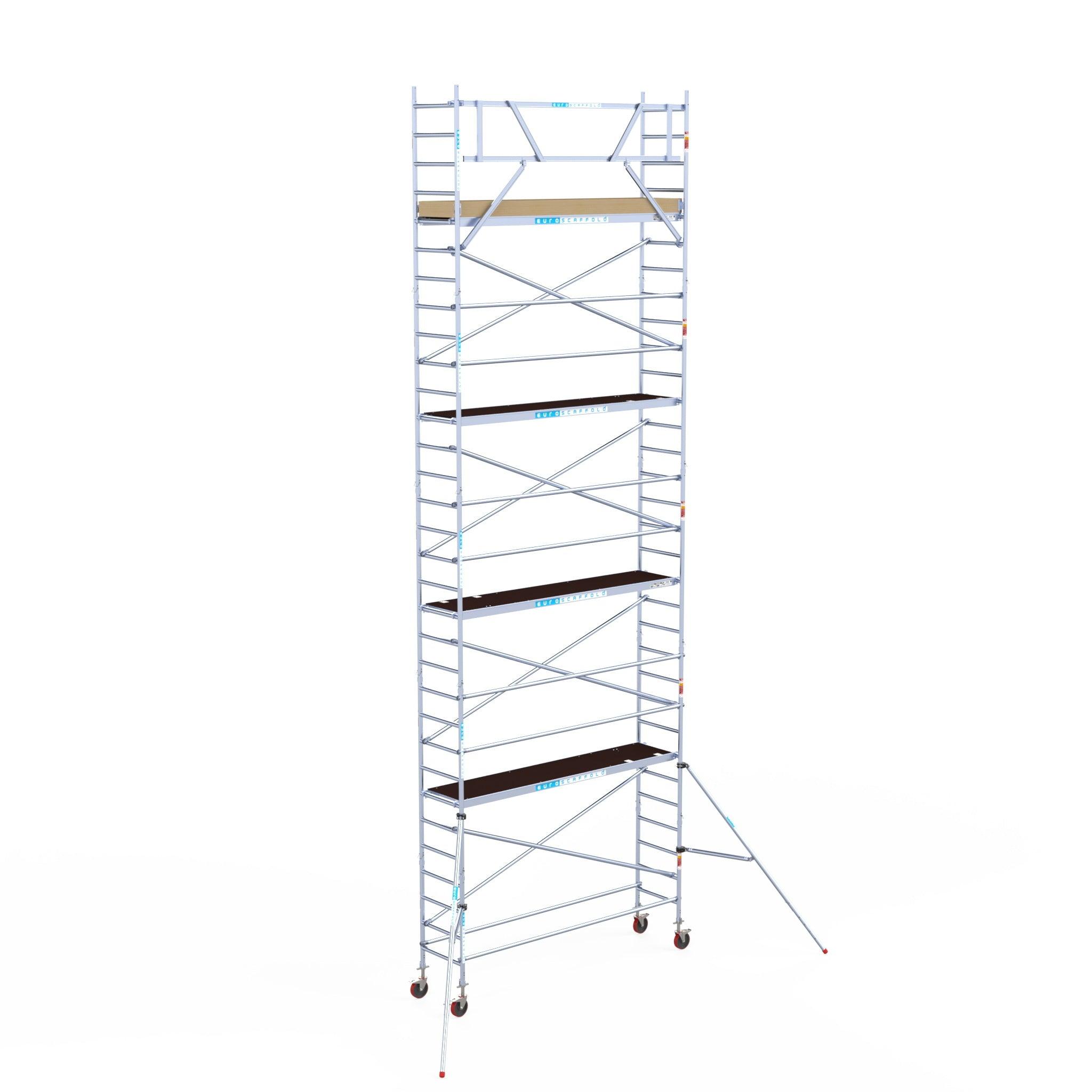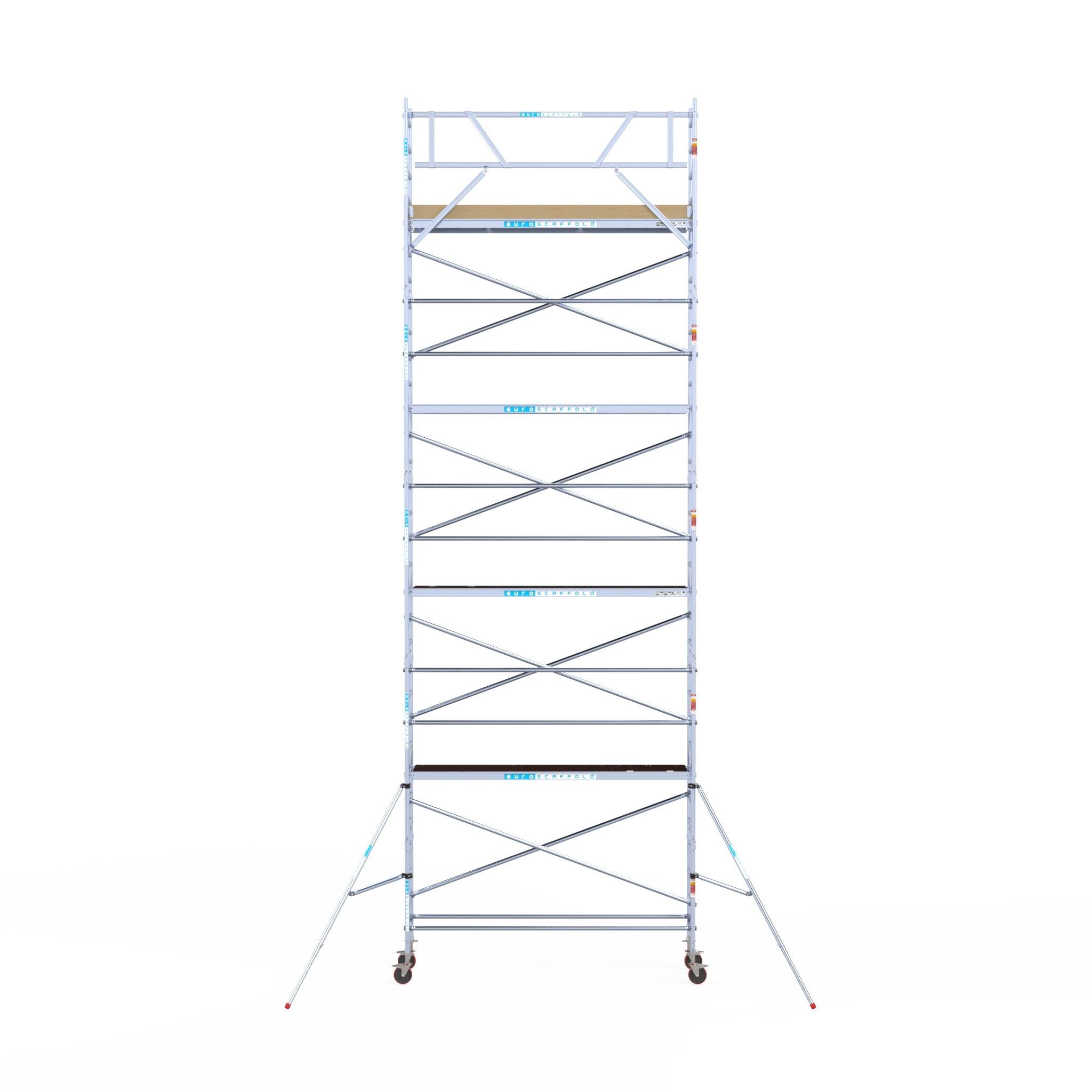 L'échafaudage mobile fourni offre une hauteur de travail de 10,2 mètres, une hauteur fréquemment utilisée par les artisans et les entreprises de maintenance pour les travaux de façades et de toitures. D'une largeur de 75 cm, il est le plus étroit de notre gamme et idéal pour les travaux dans les allées et les chemins. Sa longueur de 305 cm permet à plusieurs personnes de travailler dessus ou, par exemple, d'y stocker du matériel.