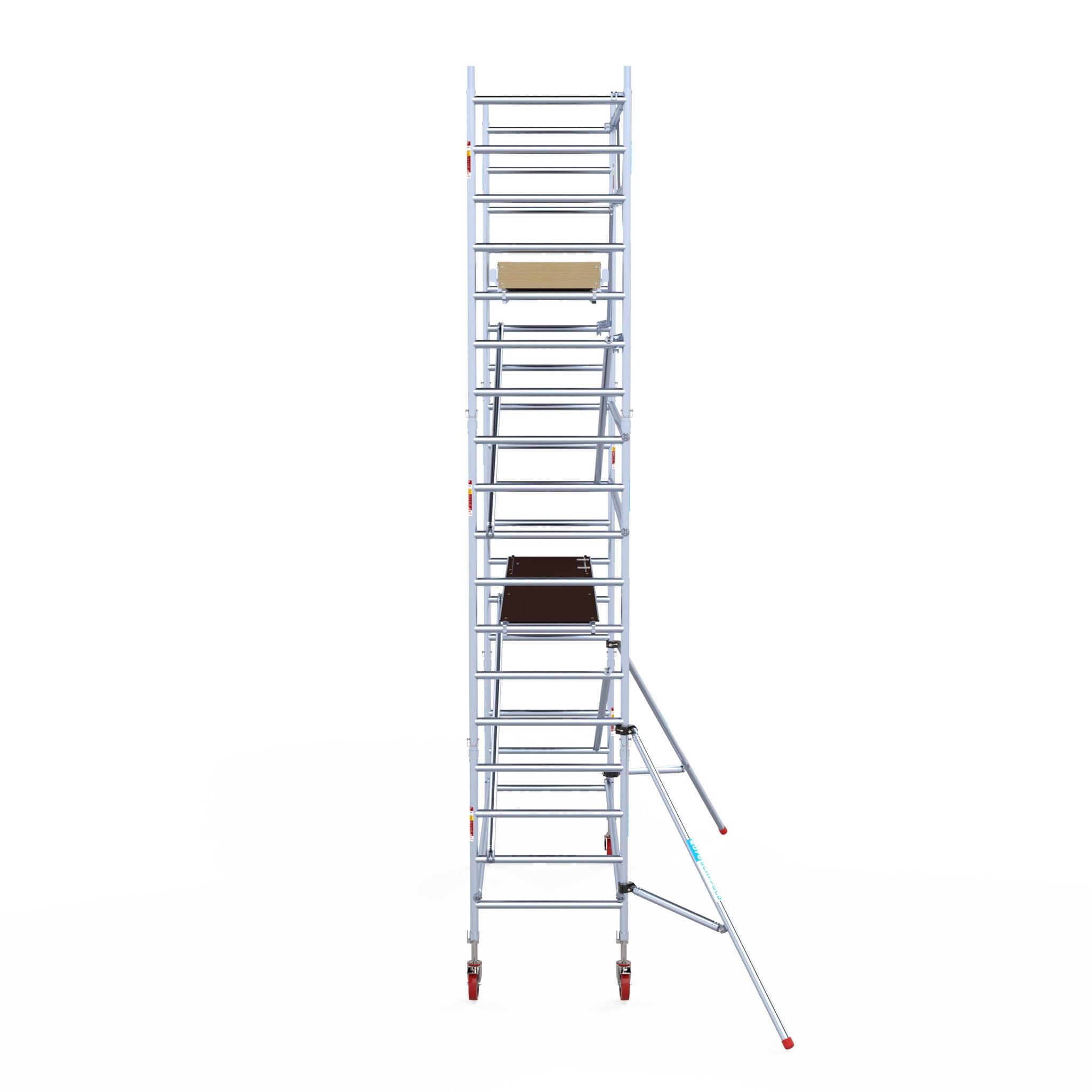 Unsere Rollgerüste sind in verschiedenen Breiten erhältlich, typischerweise 75 cm, 90 cm und 135 cm, abhängig vom jeweiligen Modell und der Produktlinie (semi-professionell oder professionell). Die 75 cm Breite ist ideal für beengte Räume, während 135 cm maximale Arbeitsfläche bietet.
