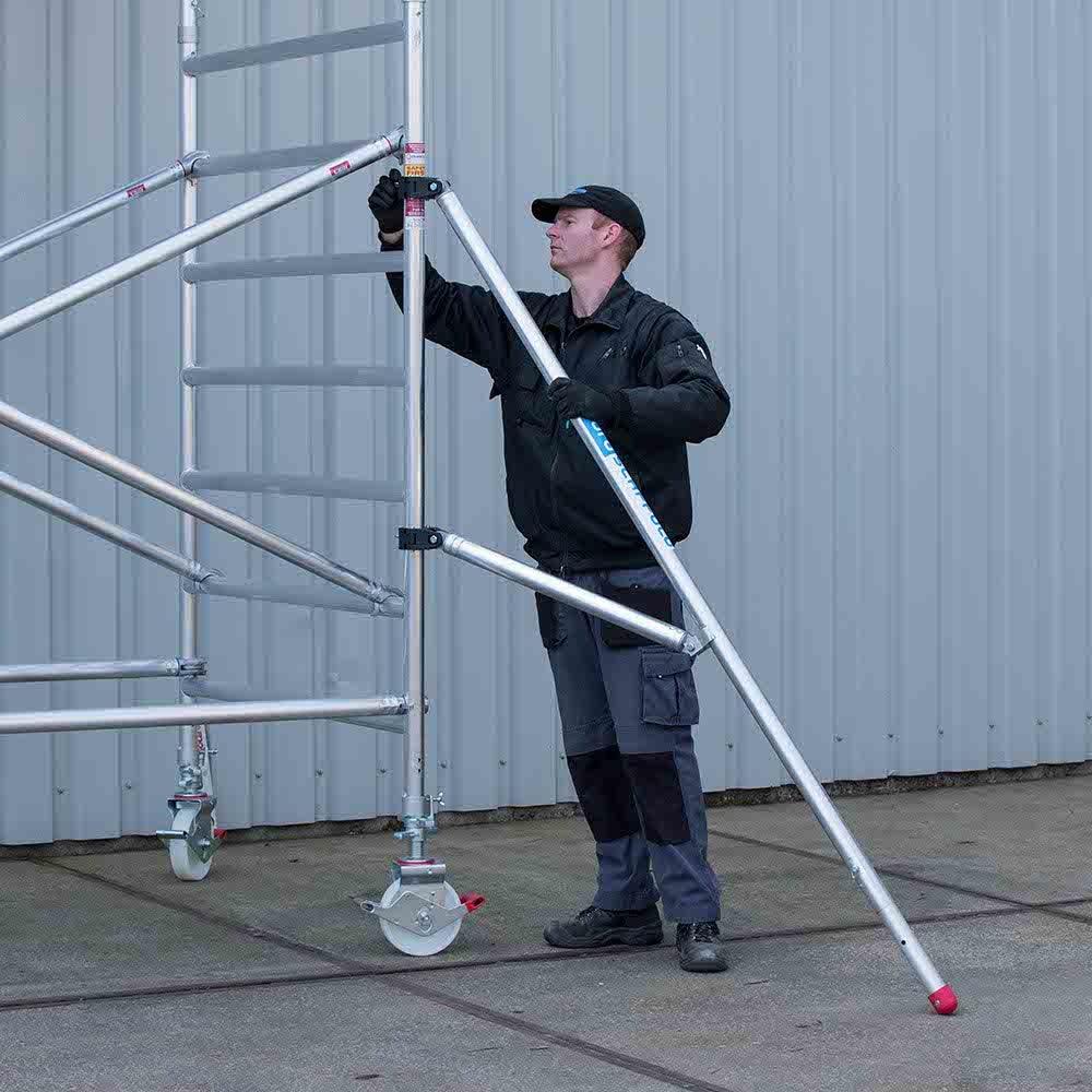 Unsere Rollgerüste sind in verschiedenen Breiten erhältlich, typischerweise 75 cm, 90 cm und 135 cm, abhängig vom jeweiligen Modell und der Produktlinie (semi-professionell oder professionell). Die 75 cm Breite ist ideal für beengte Räume, während 135 cm maximale Arbeitsfläche bietet.