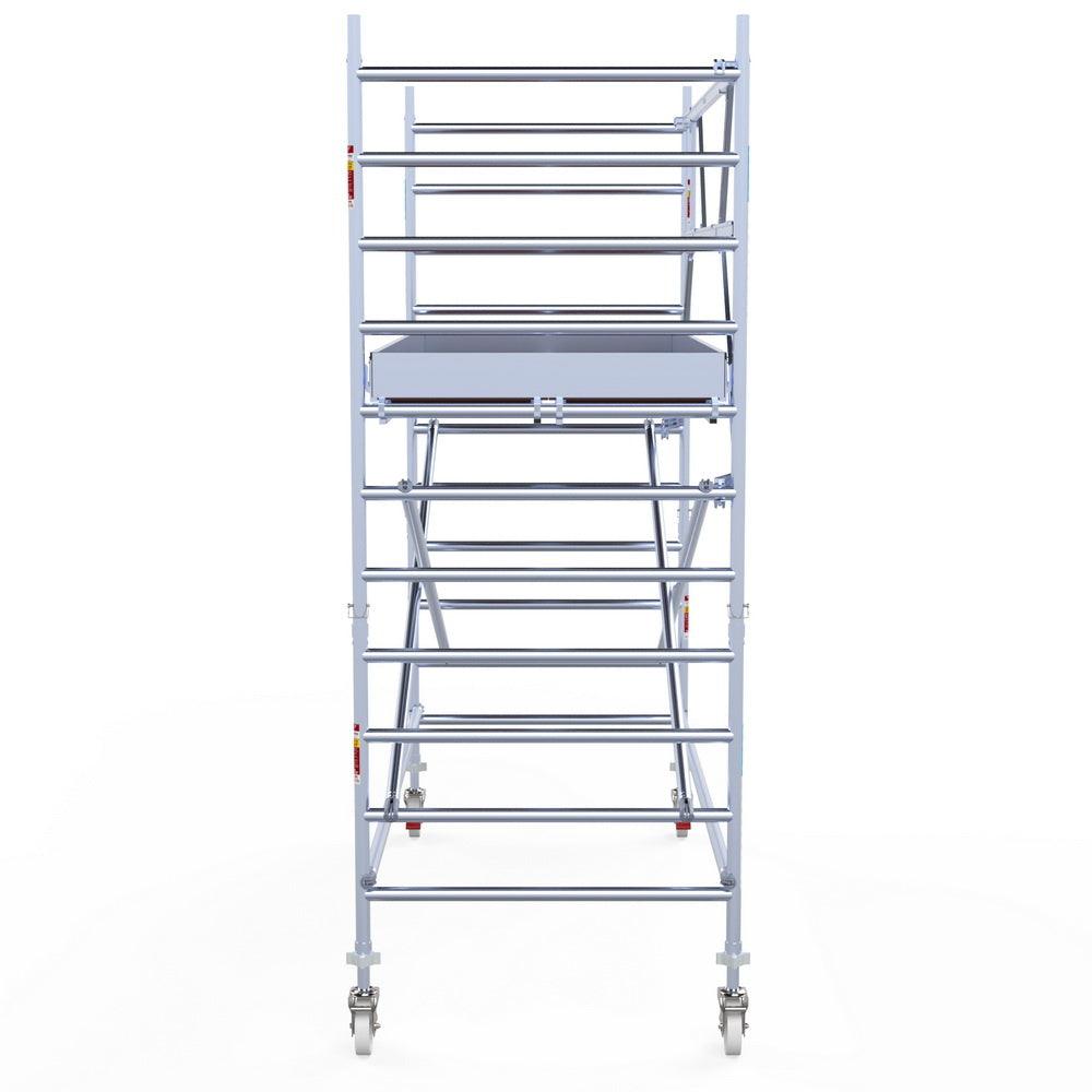 Unsere Rollgerüste sind in verschiedenen Breiten erhältlich, typischerweise 75 cm, 90 cm und 135 cm, abhängig vom jeweiligen Modell und der Produktlinie (semi-professionell oder professionell). Die 75 cm Breite ist ideal für beengte Räume, während 135 cm maximale Arbeitsfläche bietet.