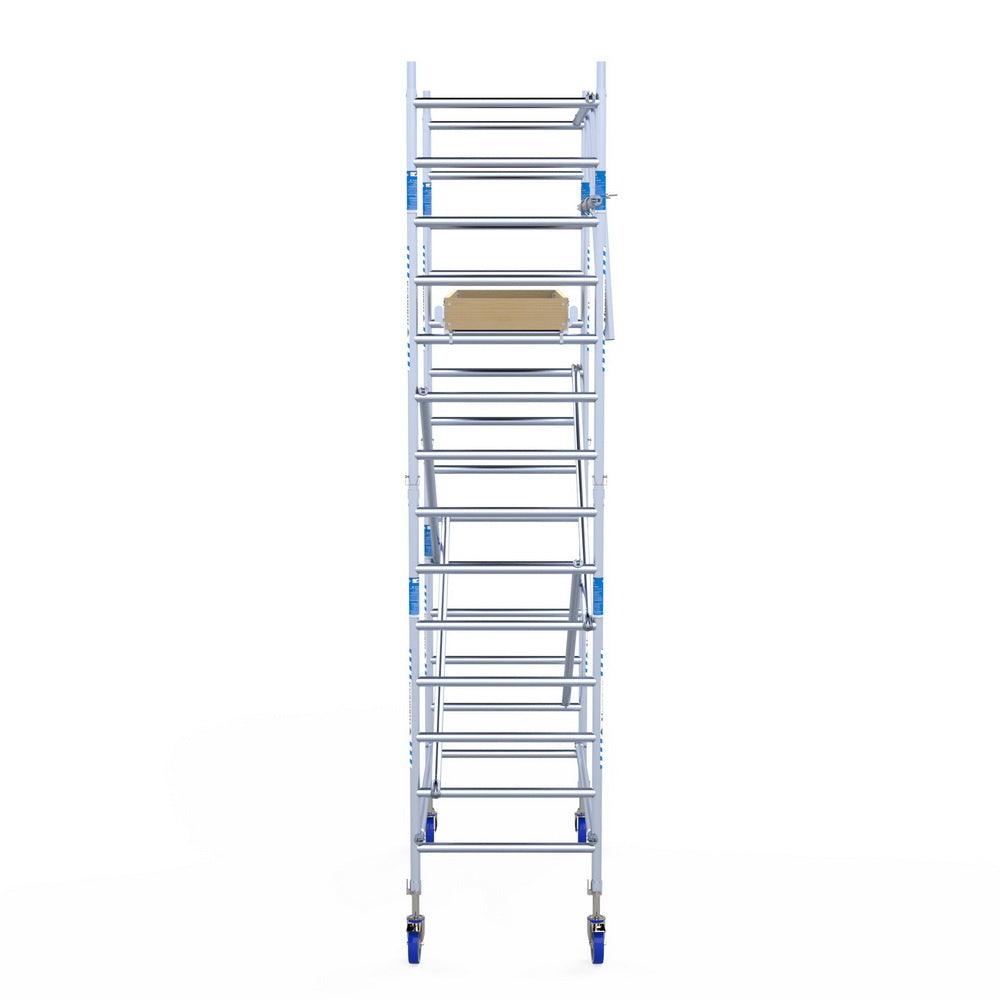 Unsere Rollgerüste sind in verschiedenen Breiten erhältlich, typischerweise 75 cm, 90 cm und 135 cm, abhängig vom jeweiligen Modell und der Produktlinie (semi-professionell oder professionell). Die 75 cm Breite ist ideal für beengte Räume, während 135 cm maximale Arbeitsfläche bietet.