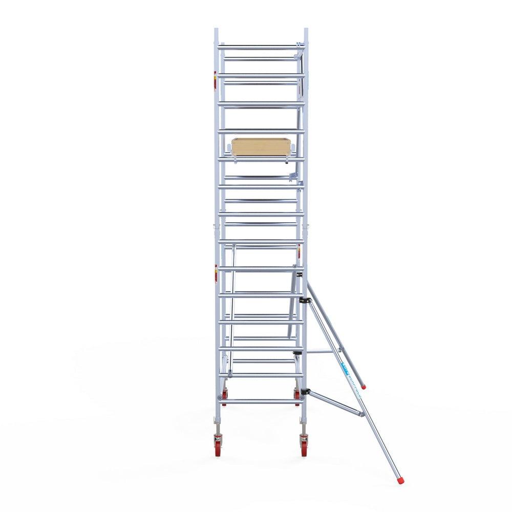 Unsere Rollgerüste sind in verschiedenen Breiten erhältlich, typischerweise 75 cm, 90 cm und 135 cm, abhängig vom jeweiligen Modell und der Produktlinie (semi-professionell oder professionell). Die 75 cm Breite ist ideal für beengte Räume, während 135 cm maximale Arbeitsfläche bietet.